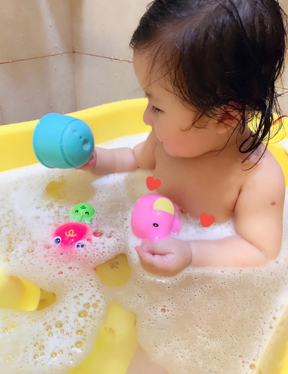 現在的洗澡時光,有了玩具安撫寶寶,洗頭變得簡單快速😅玩具在水中漂浮也可以訓練寶寶眼手抓握,媽媽終於可以好好幫寶寶洗乾淨😄