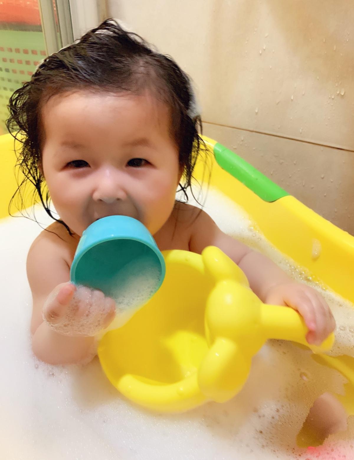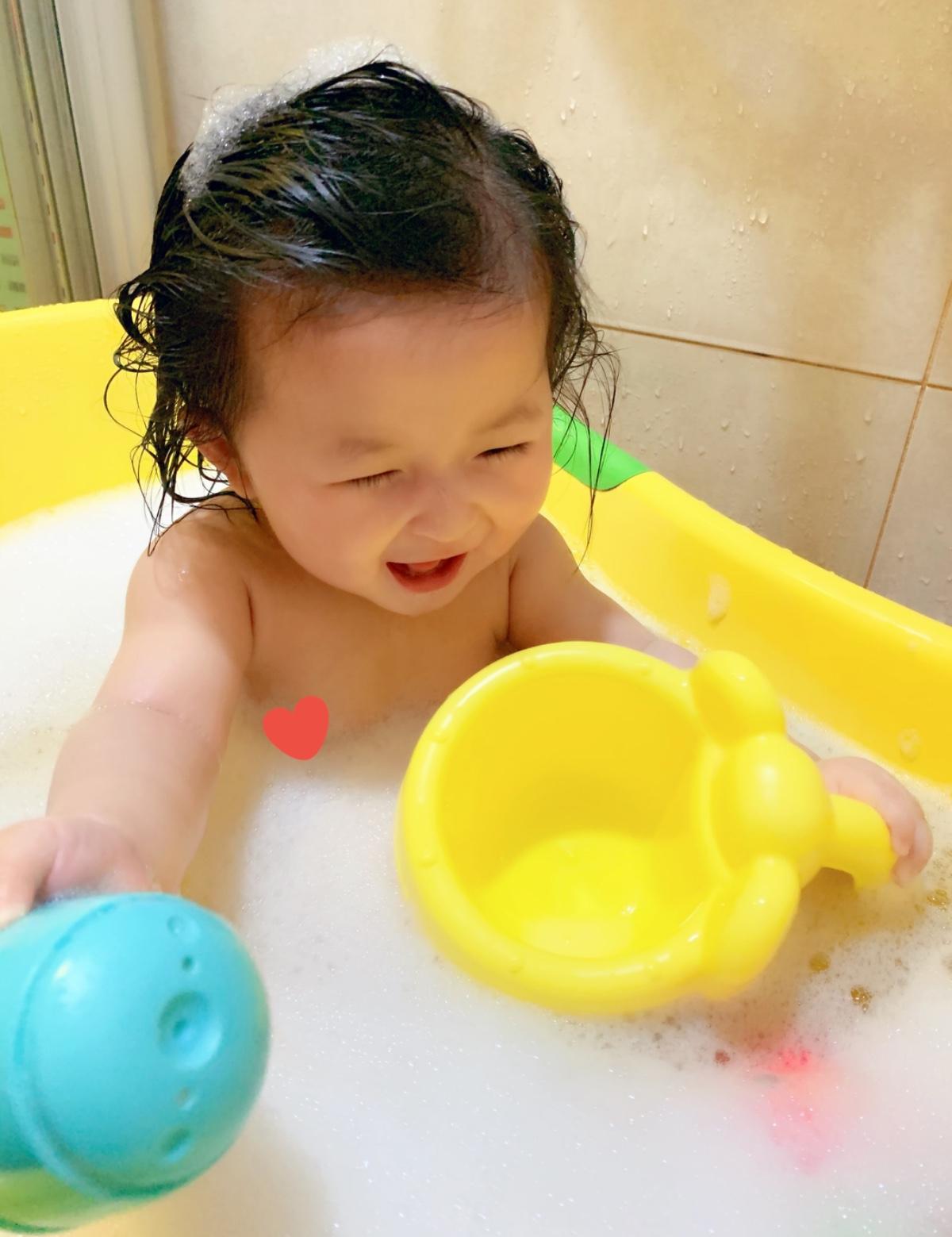 小珍珠從出生就很愛洗澡玩水❤️但越大越難控制,會坐之後她開始會歡歡😅從洗頭開始就不斷蠕動,於是媽媽開始尋找東西轉移她的注意力。