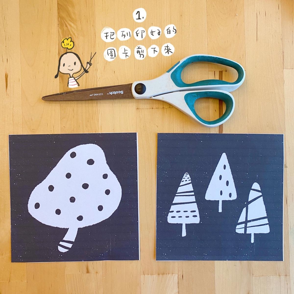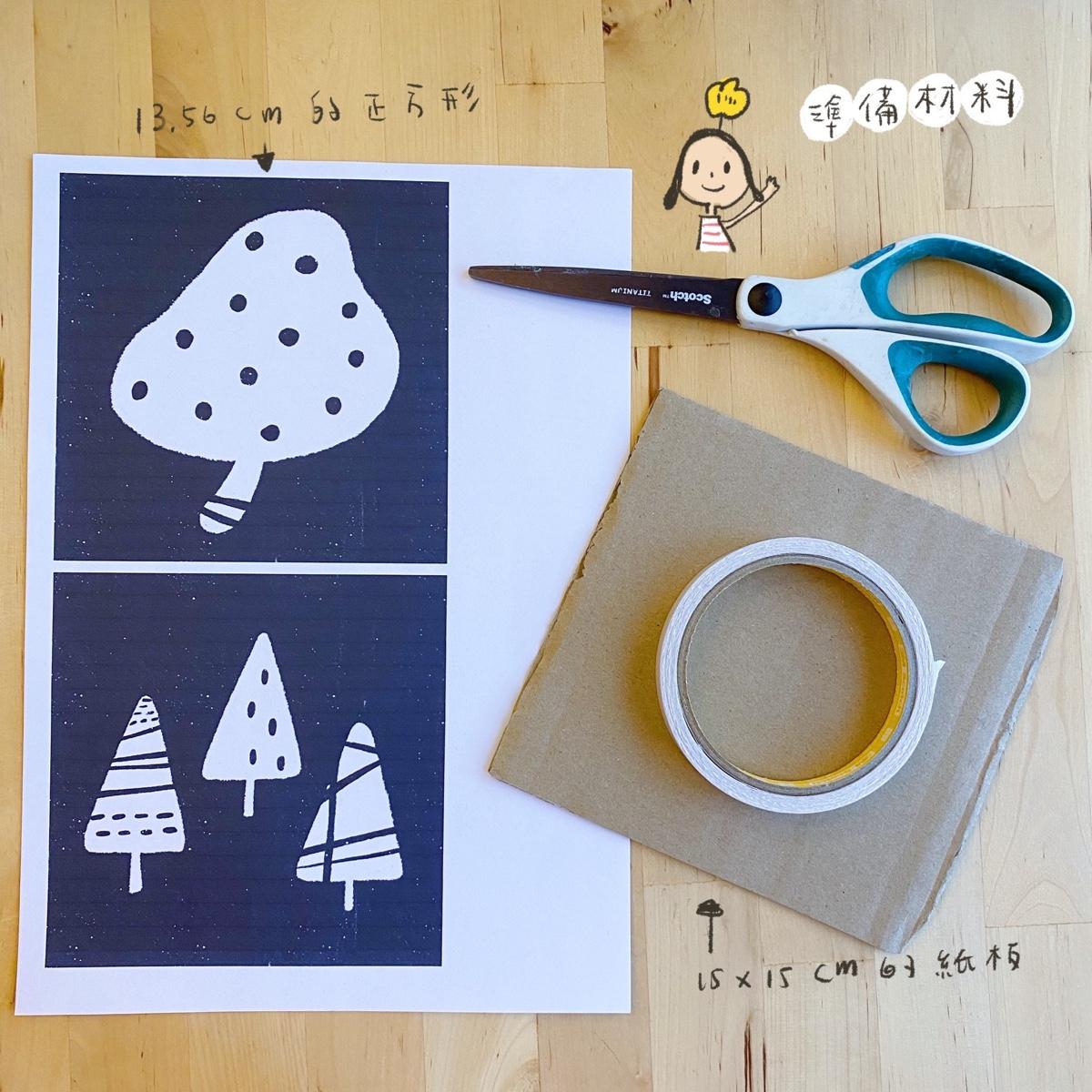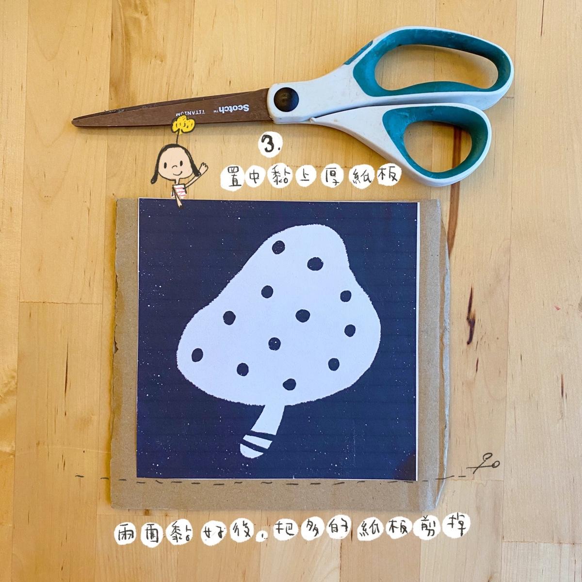 準備材料:列印圖卡、剪刀、雙面膠、厚紙板(要比圖卡大小大一點)
