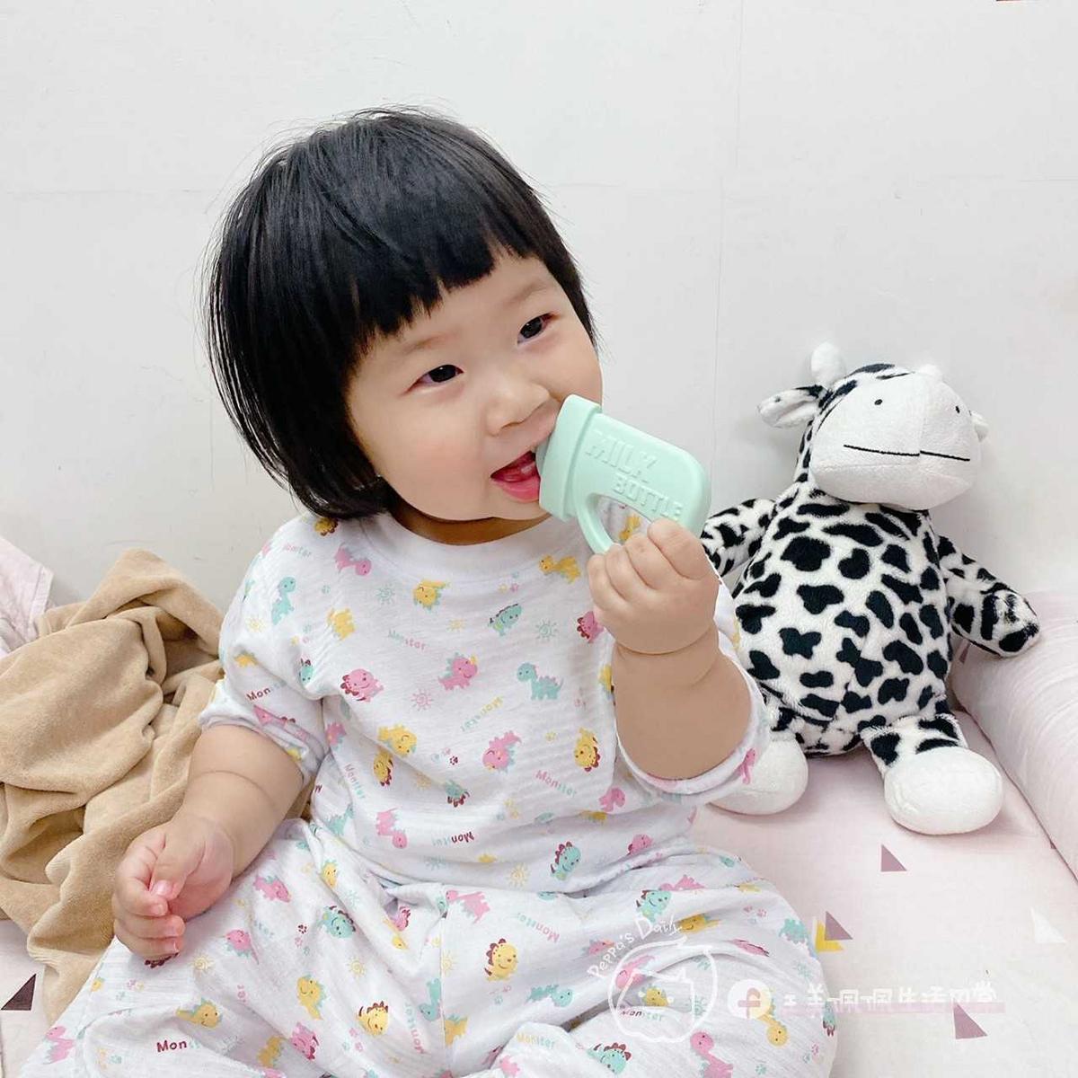 固齒器做成奶瓶型狀,除了可愛特別,也更能吸引寶寶的注意,因為在他們的眼裡,除了爸媽以外,奶瓶也是他們成長過成中很重要的記憶點,而這個奶瓶造型設計,也不單單是平平扁扁的,在奶嘴頭的部分是做成圓球型,讓寶寶不只是咬合,也可以有其他口腔發展動作,而且仿奶嘴頭的設計也讓寶寶在口感上更為熟悉,王美就很喜歡咬一咬順便吸一吸~