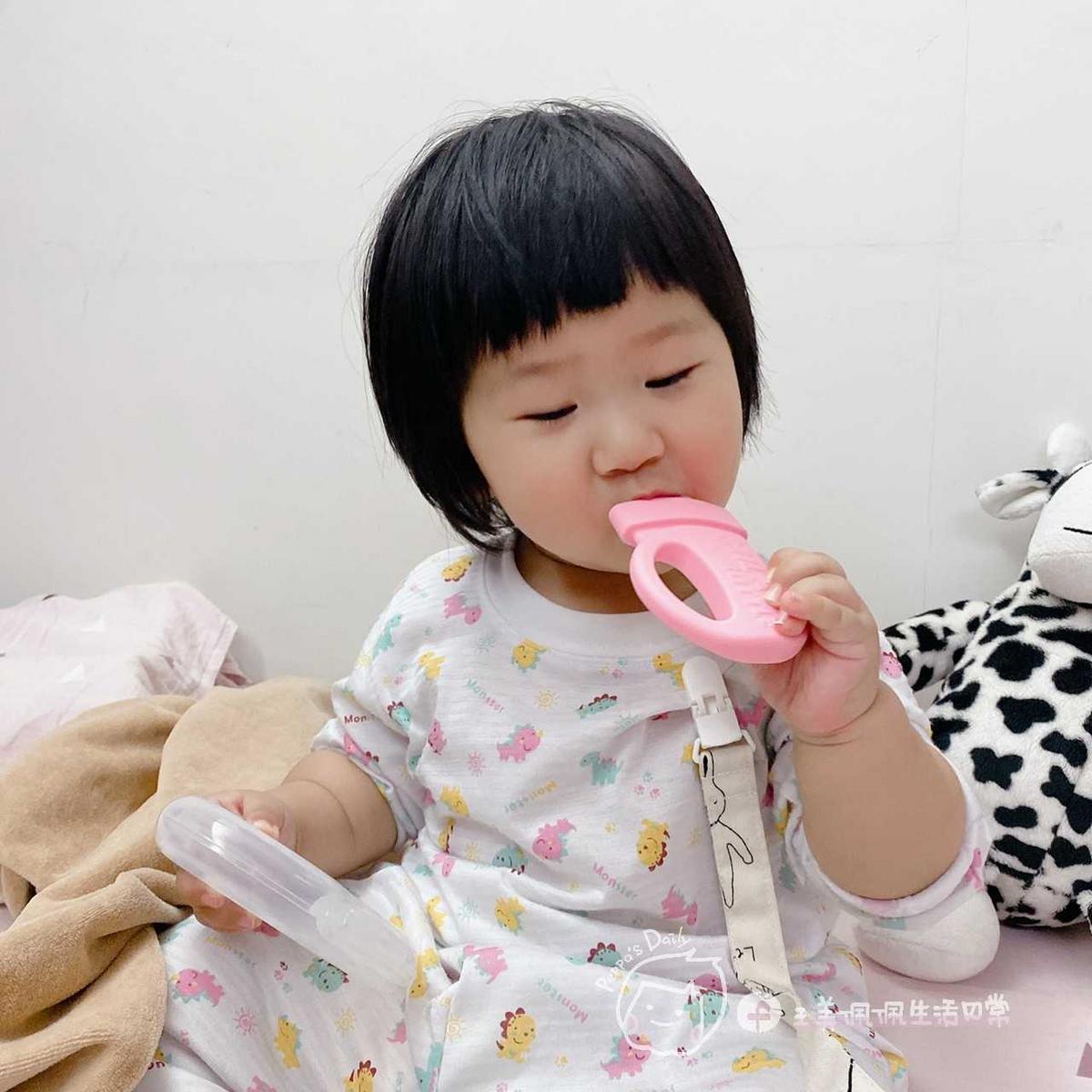 她現在開始陸續長牙了🦷,發現她不時還是會咬手手或棉被衣物,
