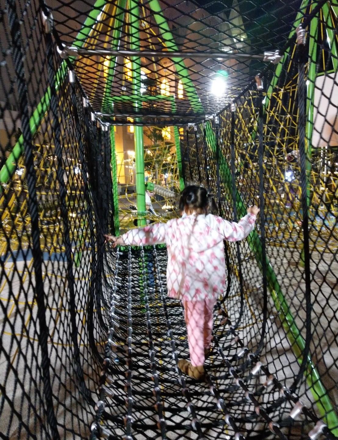 [後記] 平常周末的台茂真的人潮洶湧,所以我都平日傍晚才會帶女兒們來玩,女兒們超喜歡這裡,除了盪鞦韆、溜滑梯之外,繩索攀爬也讓他們變得更勇敢,學會挑戰自己(笑)