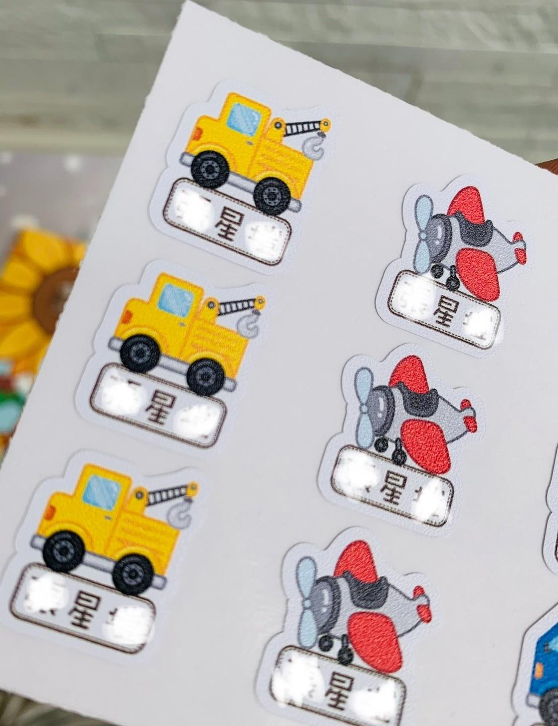最後星星媽選擇了可愛柴犬A款及交通工具2 V款(有大有小)。會選擇這2款家裡有養柴犬,當然要選一組姓名貼來用,另外交通工具星星的最愛。