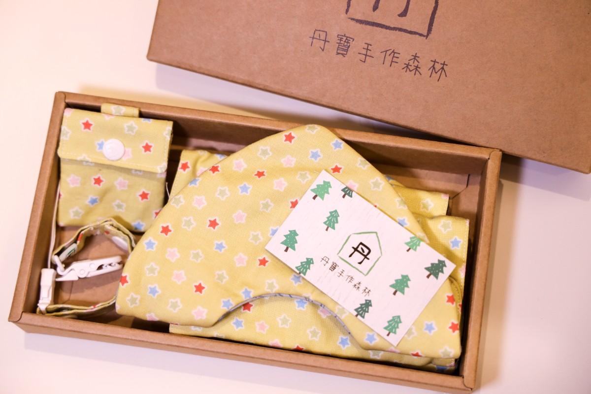 是「丹寶手作森林」的兩條圍兜、背巾布、奶嘴鍊、平安符袋,