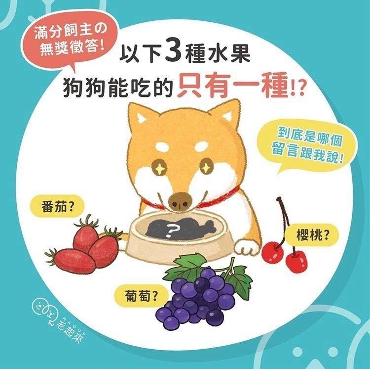 狗狗面前擺著番茄🍅、葡萄🍇、櫻桃🍒三種水果