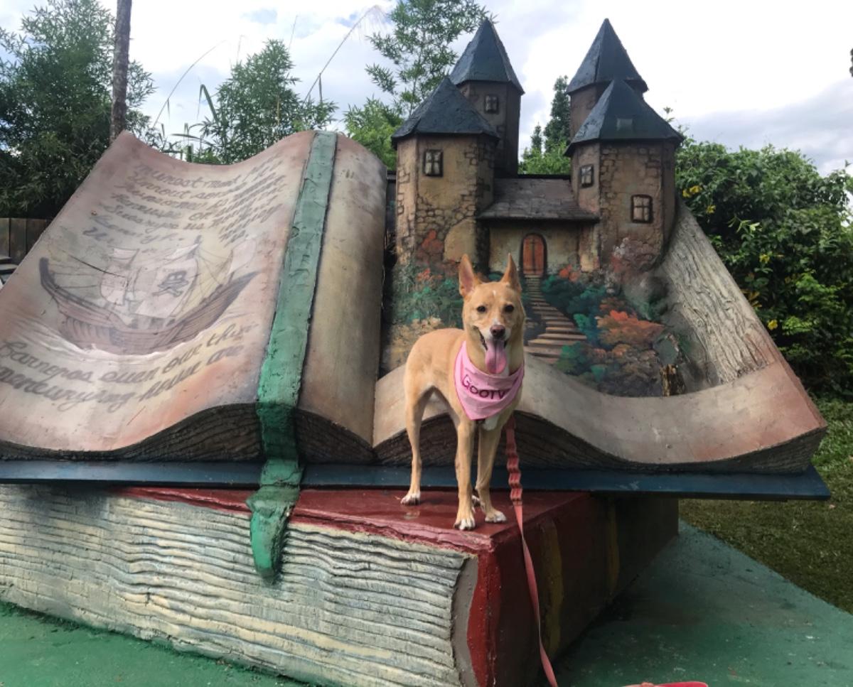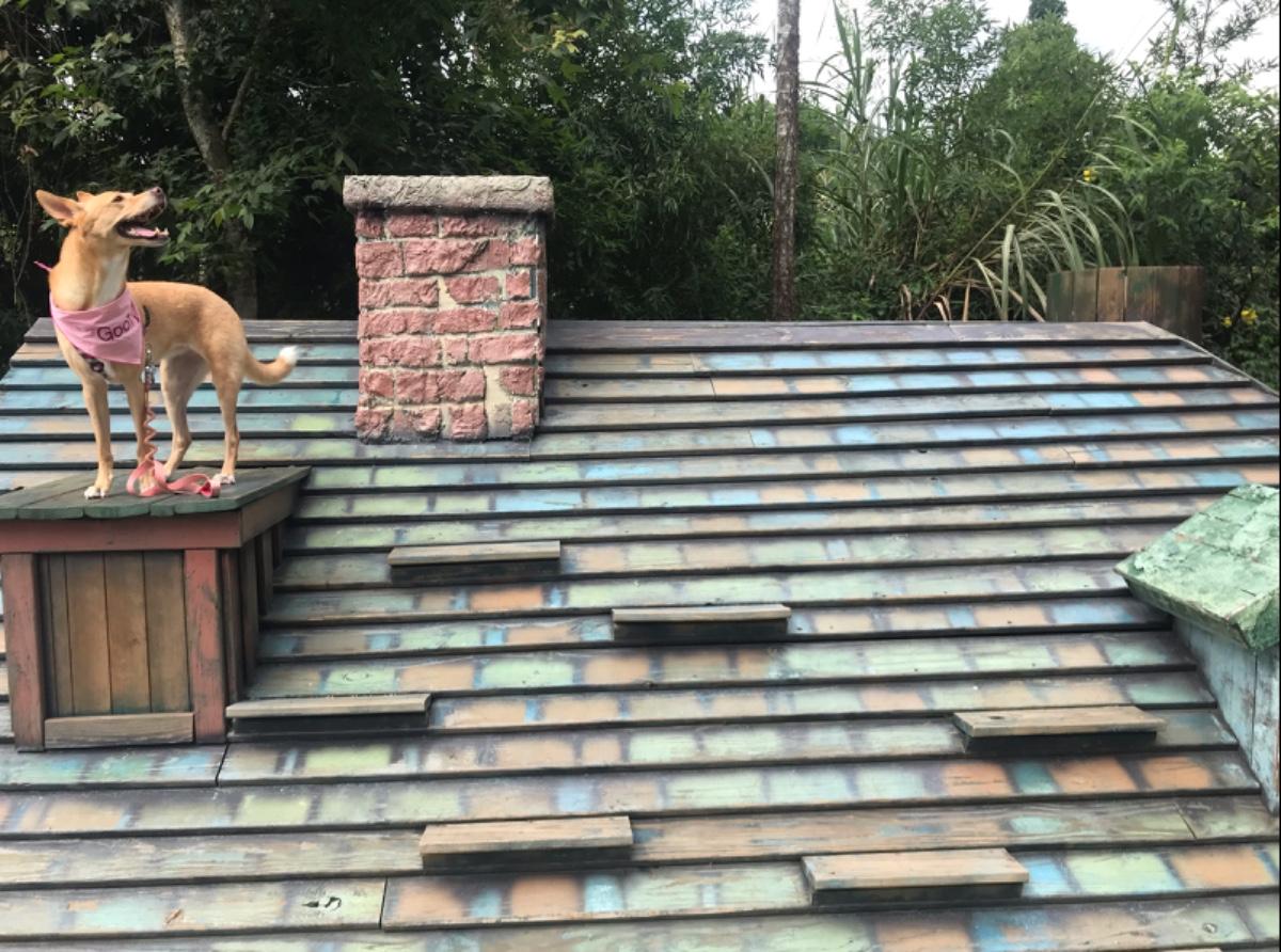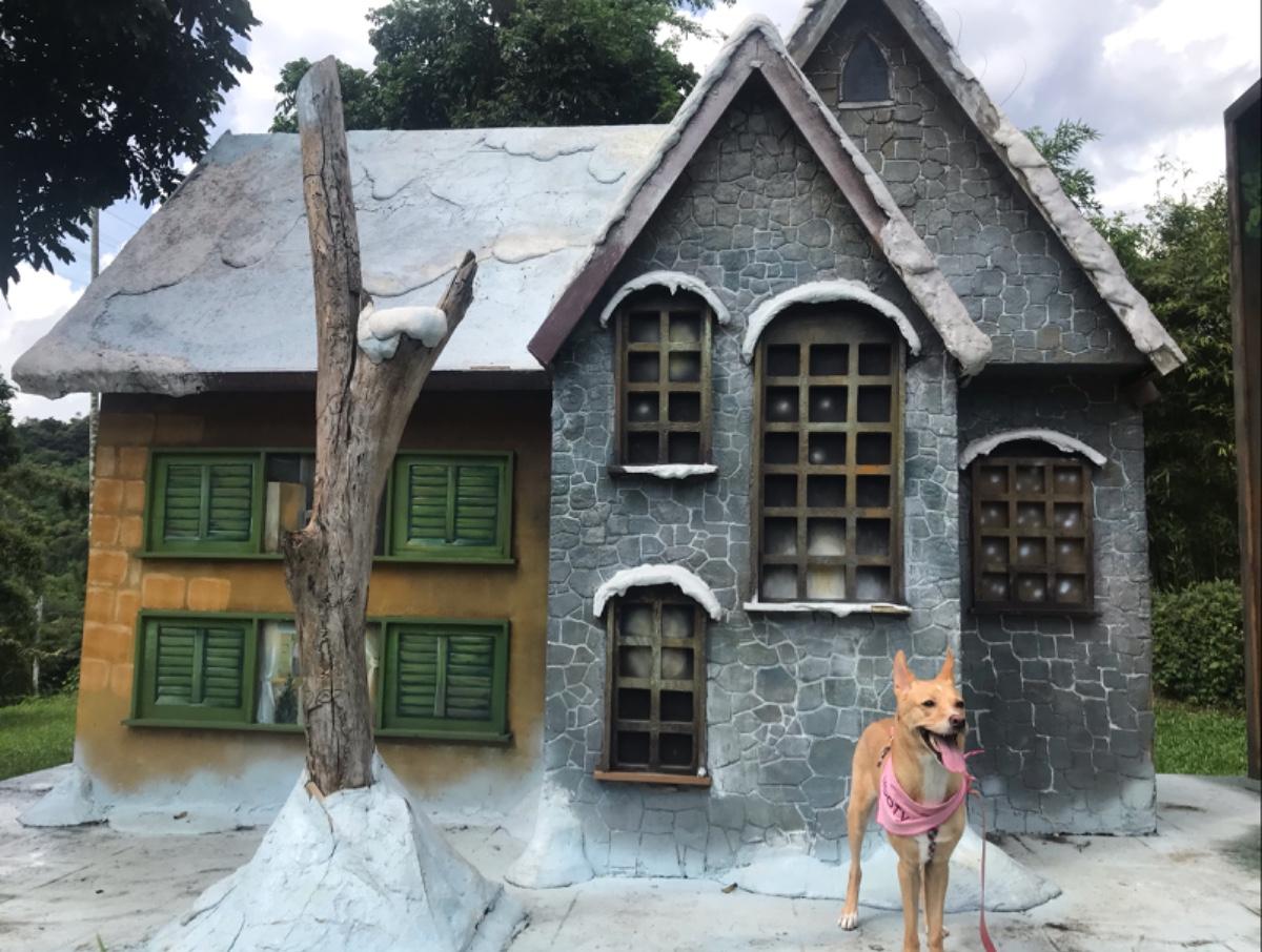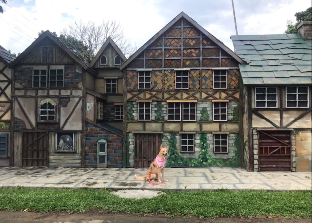 接下來會看到許多有趣的拍照場景、彩繪藝術;站在縮小的街景裡,菲菲好像誤闖小人國的巨犬喔!看到許多獨棟的小木屋,才知道海盜村也有住宿服務,但應該是不能帶寵物喔!