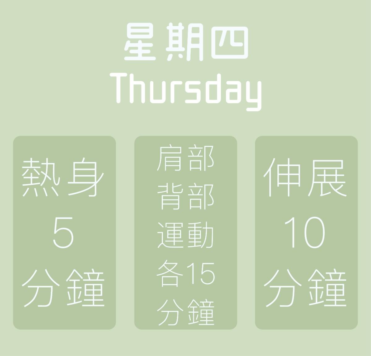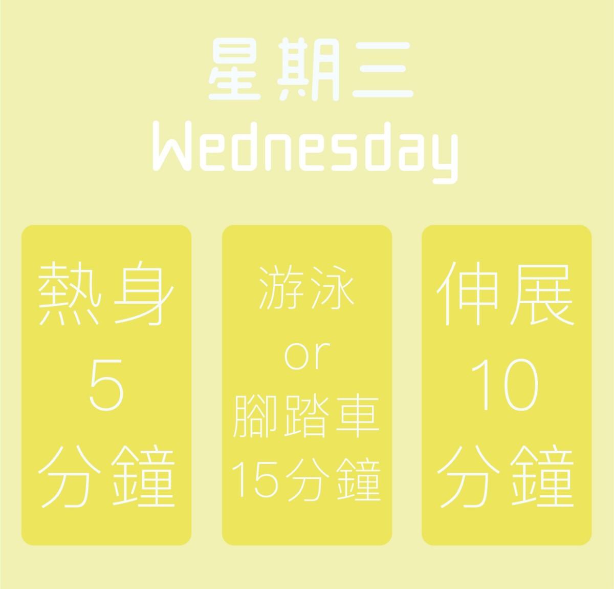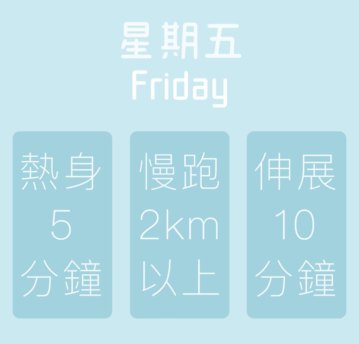 最後一天讓身體放鬆一下,可以是運動情況稍微做調整、調換,讓自己找到最適合的運動模式。