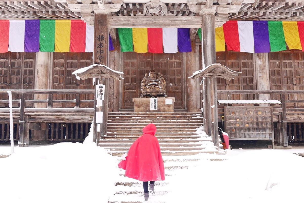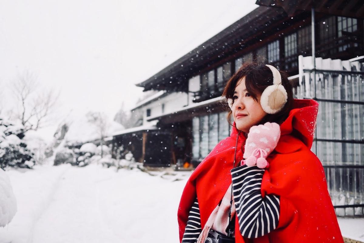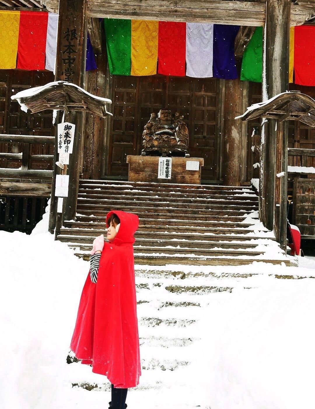 在冰天雪地搭紅色斗篷最搶眼,稍微後製就會有電影海報的感覺。