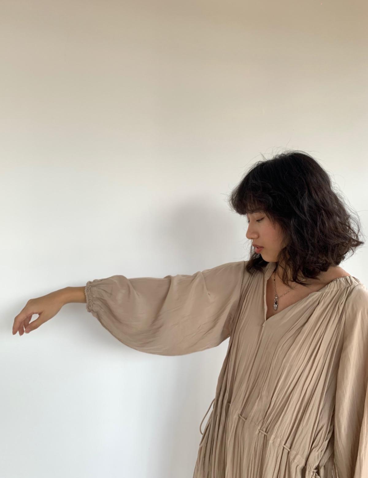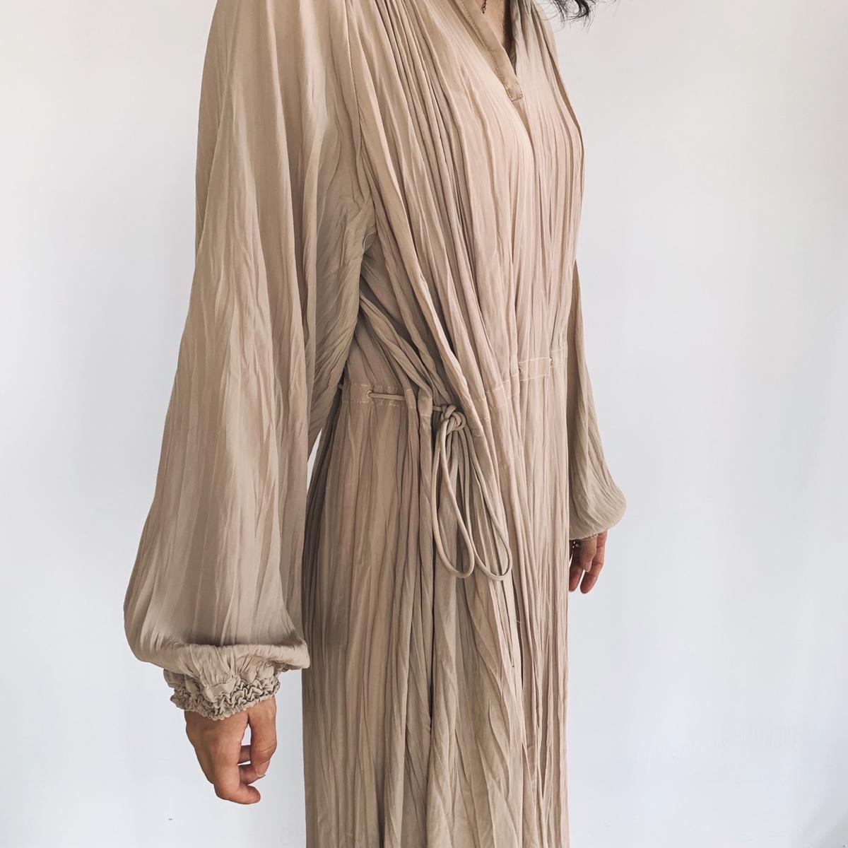 當初看上這件洋裝是因為材質設計很特別,有點像是日本設計師品牌「三宅一生」的皺褶美學,雪紡紗的材質上面佈滿皺褶,非常低調又內斂,第一眼看上就決定要買~