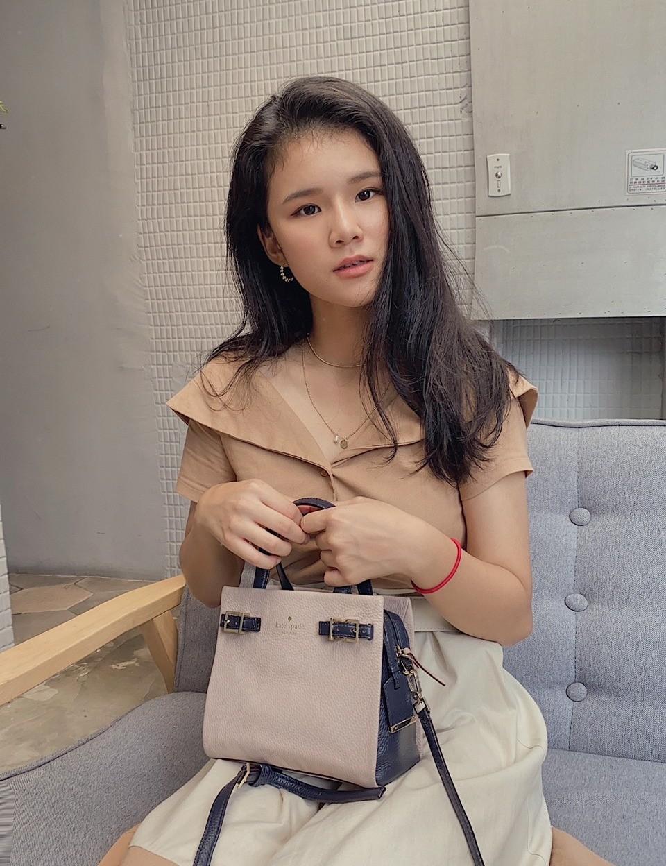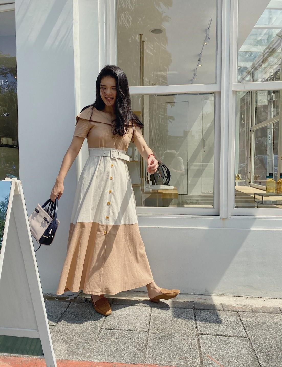 除了拼接設計之外,領口的設計可以小露鎖骨或是拉成平肩