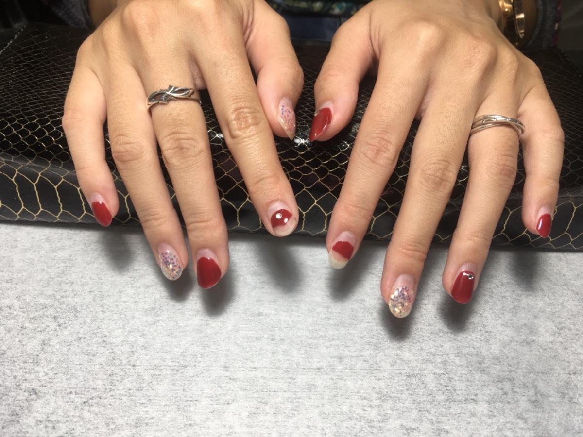 我第一次做的時候選的是最基礎的方案「基礎保養+跳一色+三顆鑽」我選了有點帶紫的紅色以及閃亮亮的亮片再請美甲師隨機貼三顆鑽!