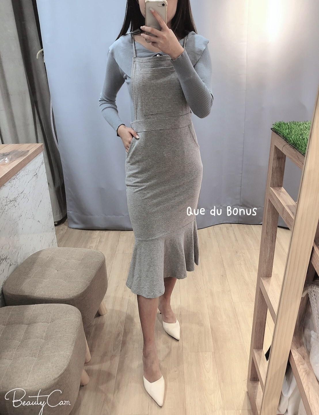 所以這套是藍色針織衣加上七分長灰色吊帶裙,