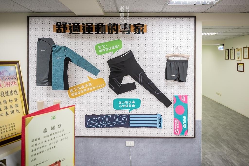 做完令人眼見為憑的臭味實驗後,陳經理帶著我們一行人在履歷牆前為我們說明斯傑利公司以科技、健康與機能為核心,以除臭襪做為出發,再慢慢地拓展到男女貼身衣著以及機能壓力褲。