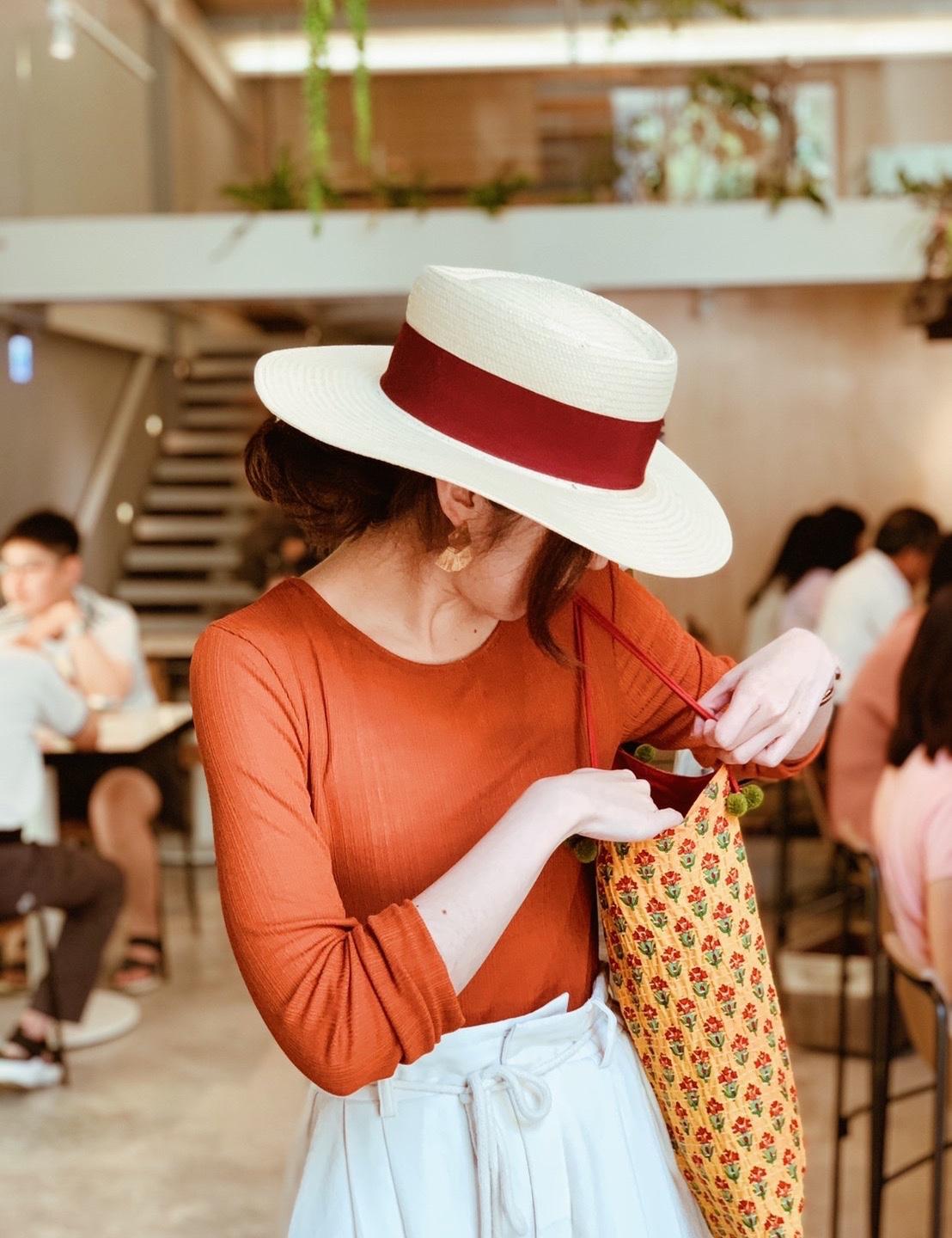 紅緞帶帽子+橘子色上衣+亮黃色背包