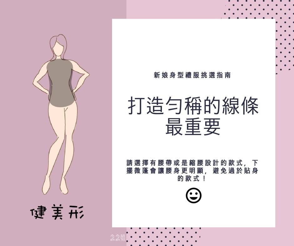 俗話說:『三分靠身材,七分靠剪裁。』健美型的人最重要的就是『製造線條』,因為這樣的身型問題在於沒有腰身,所以我們要憑藉好的禮服將失散已久的腰線通通找回來!