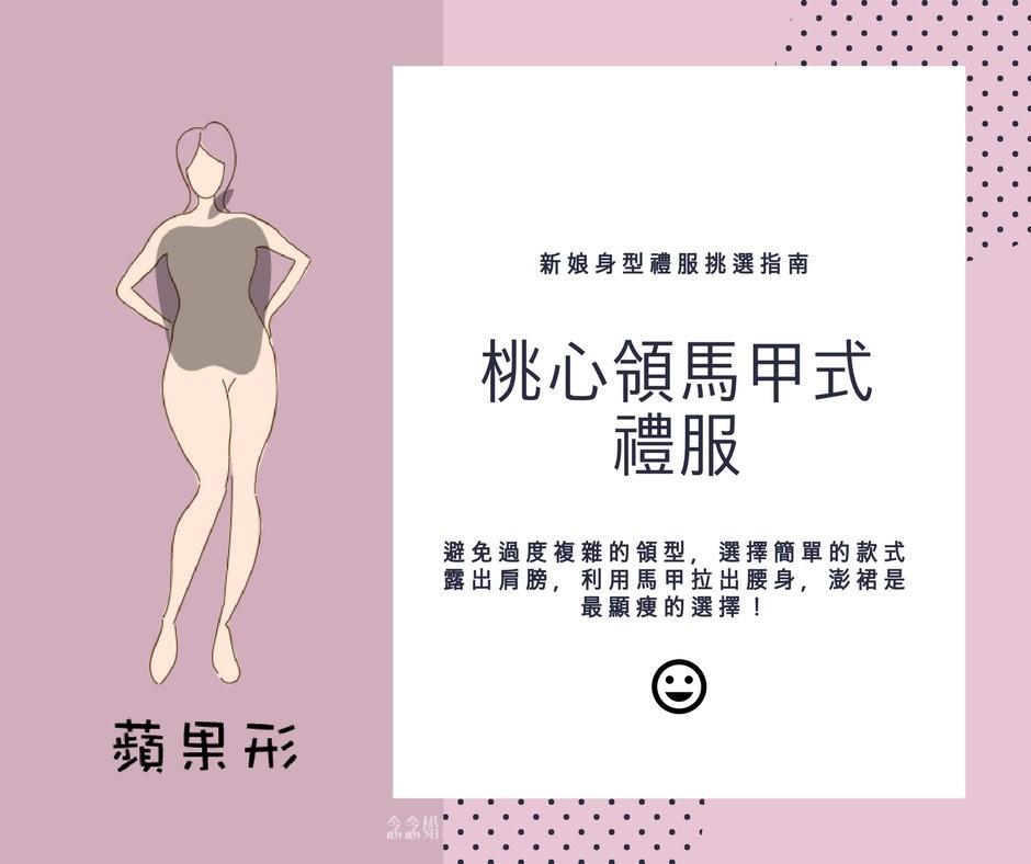 蘋果型的新娘大多較為豐腴、微肉感系的女孩,首先要先注意禮服罩杯的深淺,如果上胸圍比較豐滿,請記得一定要挑選罩杯夠深的款式,不然看起來會有快曝光的感覺,老公或是身旁的人可能會很緊張,為你捏一把冷汗。