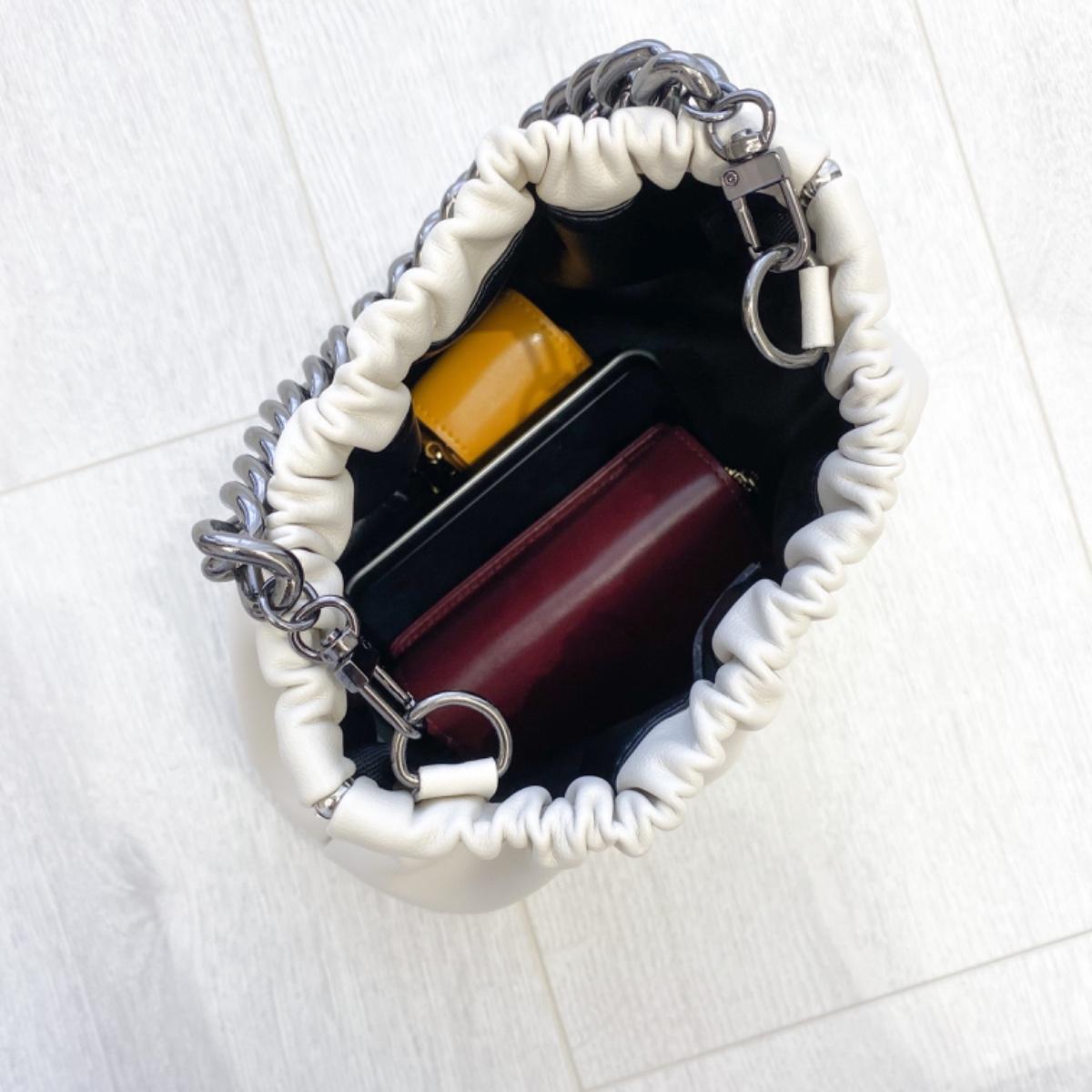 包包整體是有挺度的,本身有附細鏈而我另外加購粗鏈條,手提起來更有個性😚