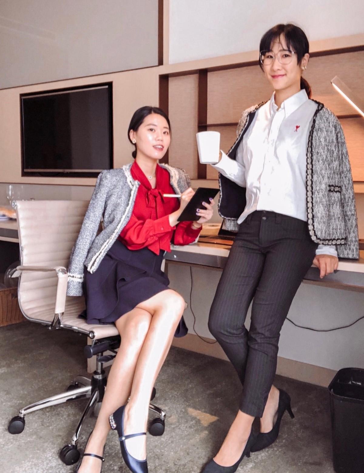 身為行銷人的E(左)喜歡選擇亮色系的服裝,讓氣色看起來更好,顯得朝氣有自信!也會搭配一些材質或剪裁較特殊的單品,展現創意性格