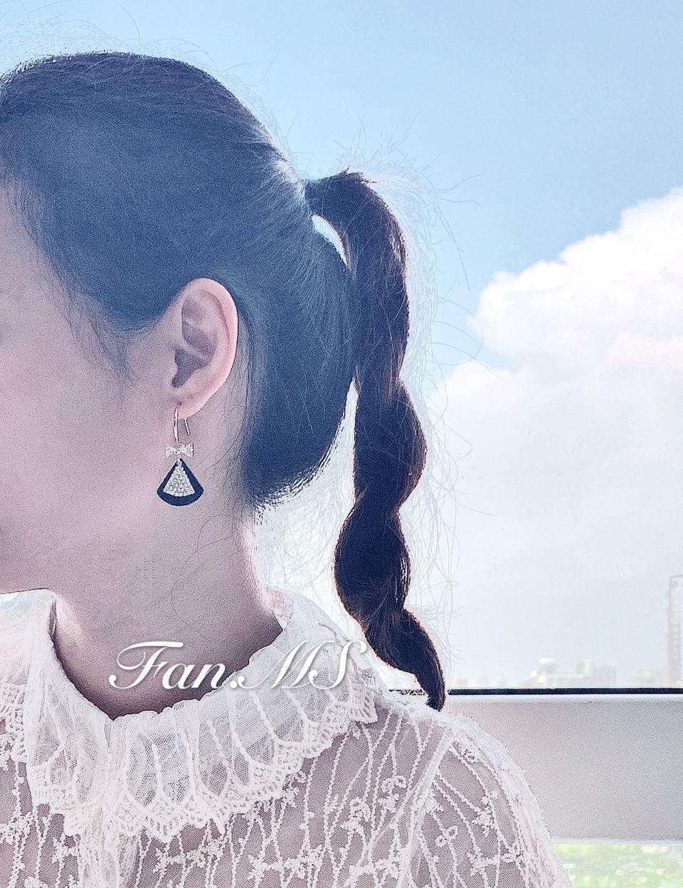 此款是後勾式耳環,玫瑰金鉤子,勾上蝴蝶結上面有個小圈,所以裙子跟碎鑽部分式可以晃動的,我特別選這個款搭配,因為蝴蝶結顯得小女人可愛的部份,但黑裙顯俐落成熟,搭配碎鑽凸顯重點,黑面+碎鑽,只要看到妳,都能馬上看出重點。