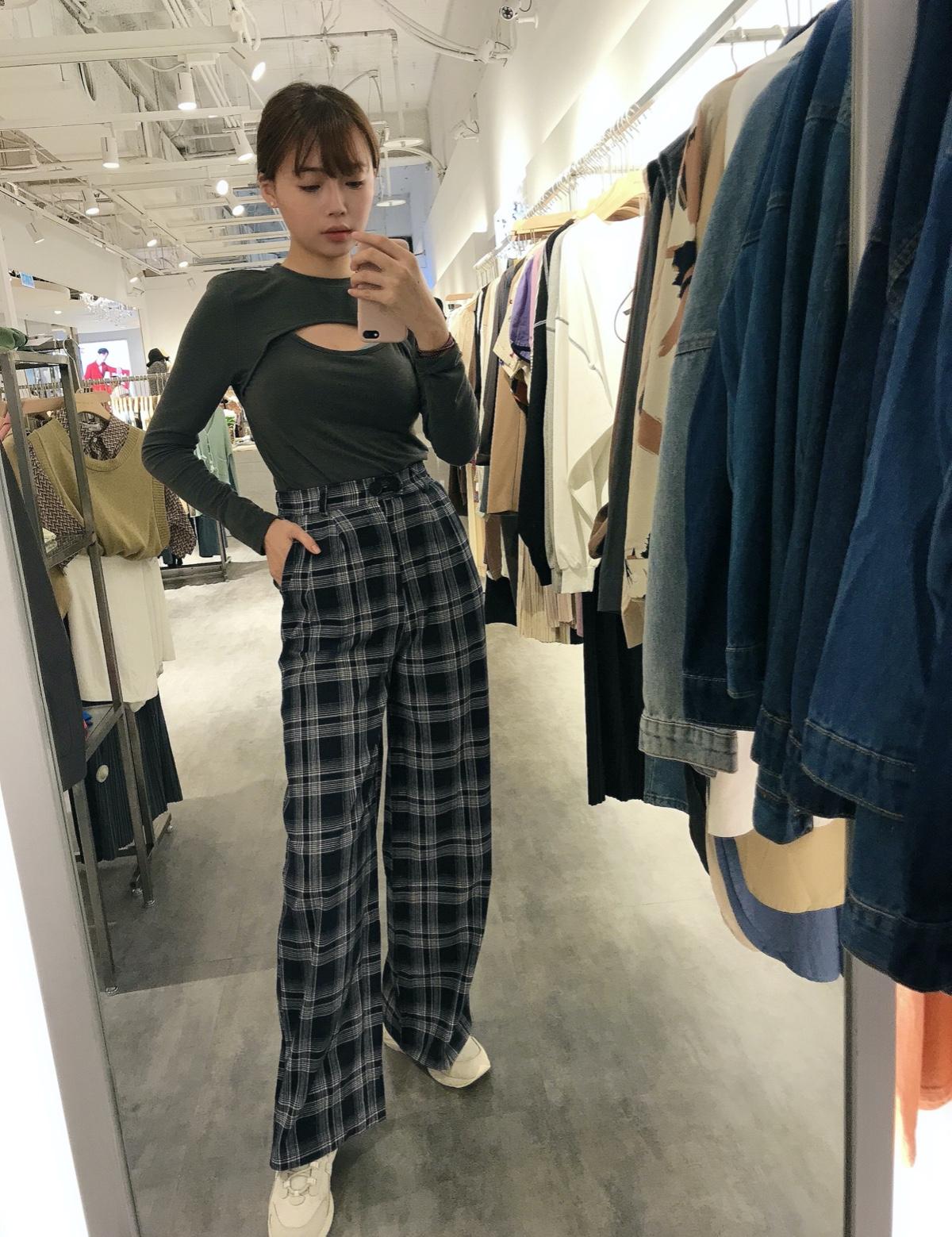 這件微性感上衣真的受到男生喜愛,男生很多私訊要買給女友 不會太露又有點小心機。 格紋褲版型有修飾到大腿假胯寬褲長落地,不買這條要買哪條~ 上衣褲子 -BLACK VIN 鞋子-new balance