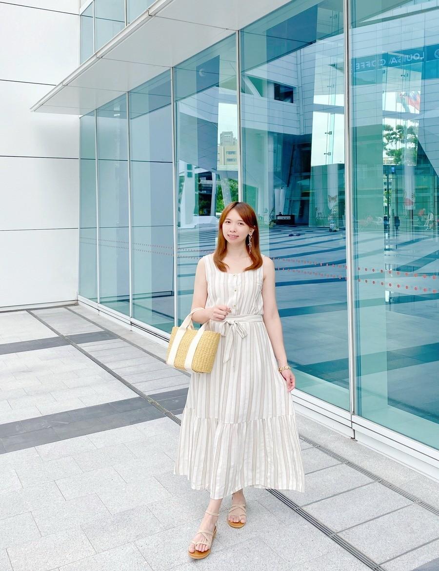 這件洋裝版型跟上一件很像,只是有直條紋、上半身有鈕釦、腰部有綁帶~它也是棉麻材質的,夏天穿一樣超涼爽,但秋天穿也很可以~因為淡奶茶色不但柔和,配色也很適合秋天,搭一件外套穿就可以囉^^