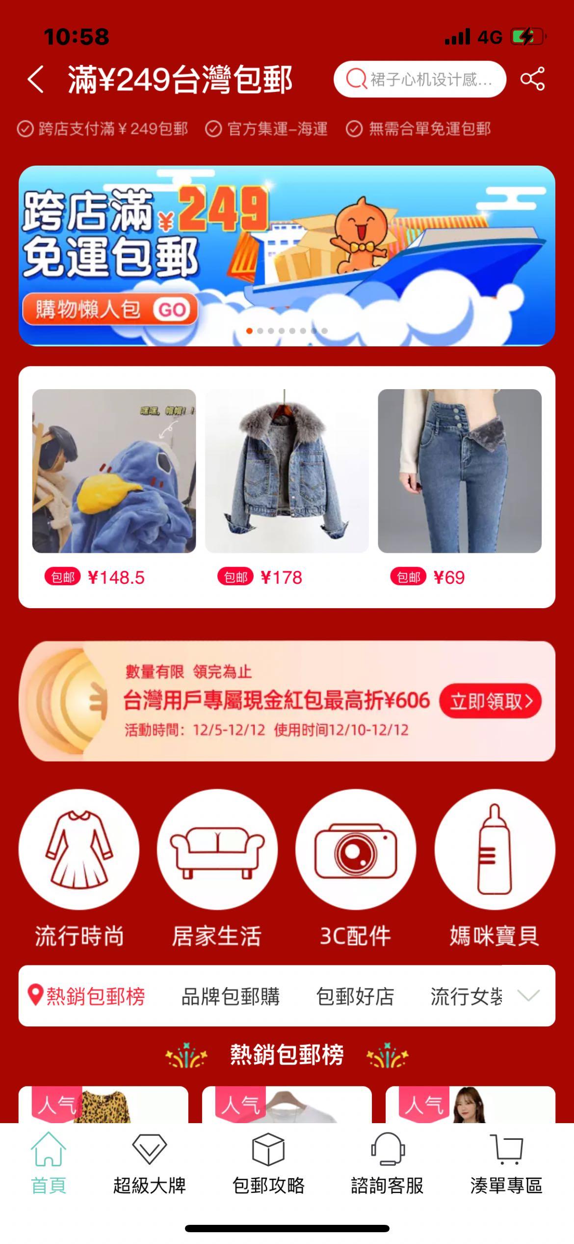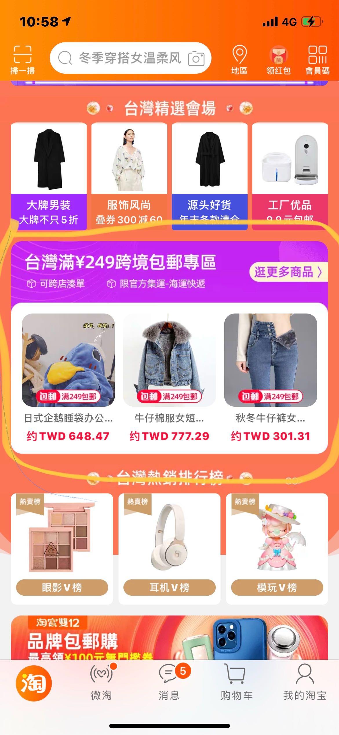 只要現在打開淘寶APP將你的所在地選擇「台灣」將有專屬寄送台灣包郵免運專區!
