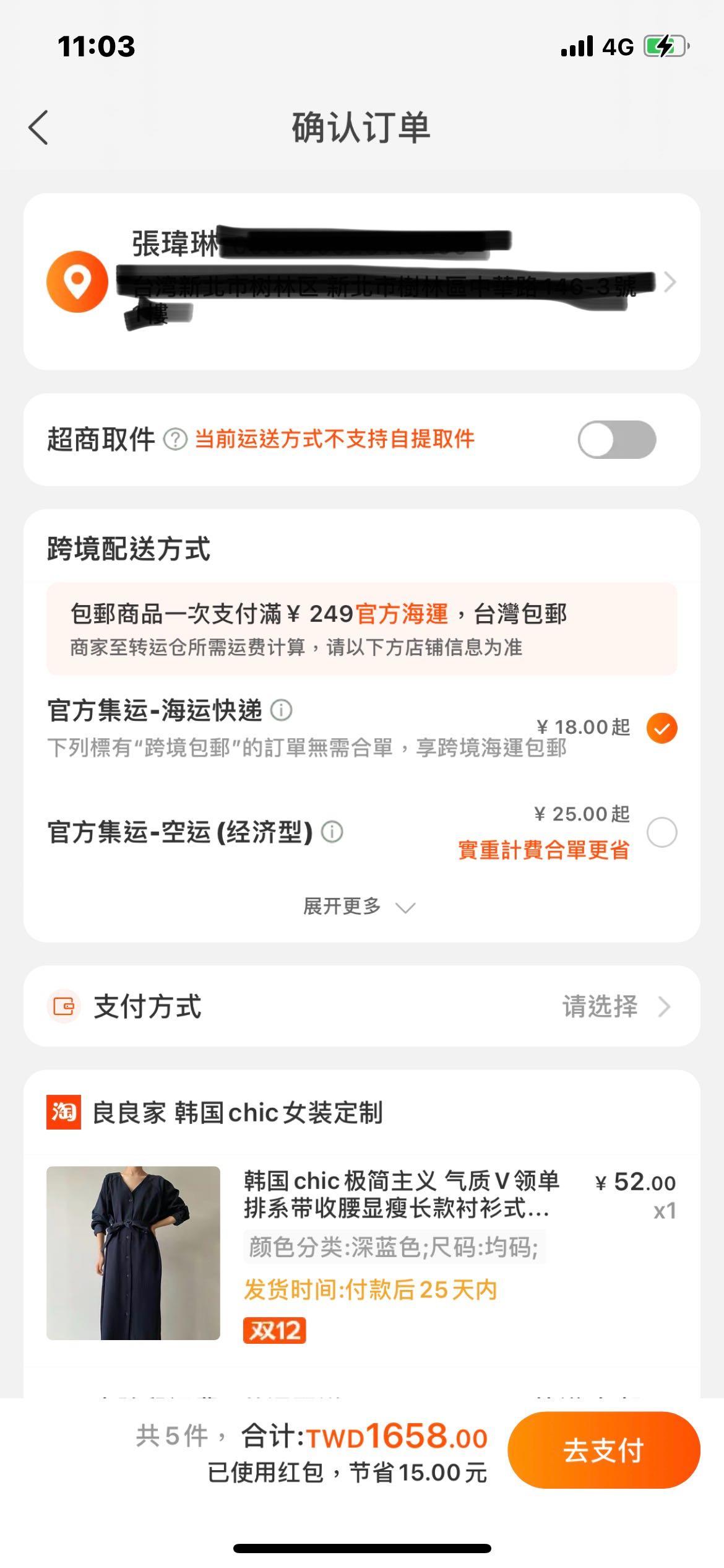開始選曲跨境配送的方式,我選擇「官方集運-海運快遞」(下標商品有包含跨境包郵的訂單都可享跨境包郵喔)