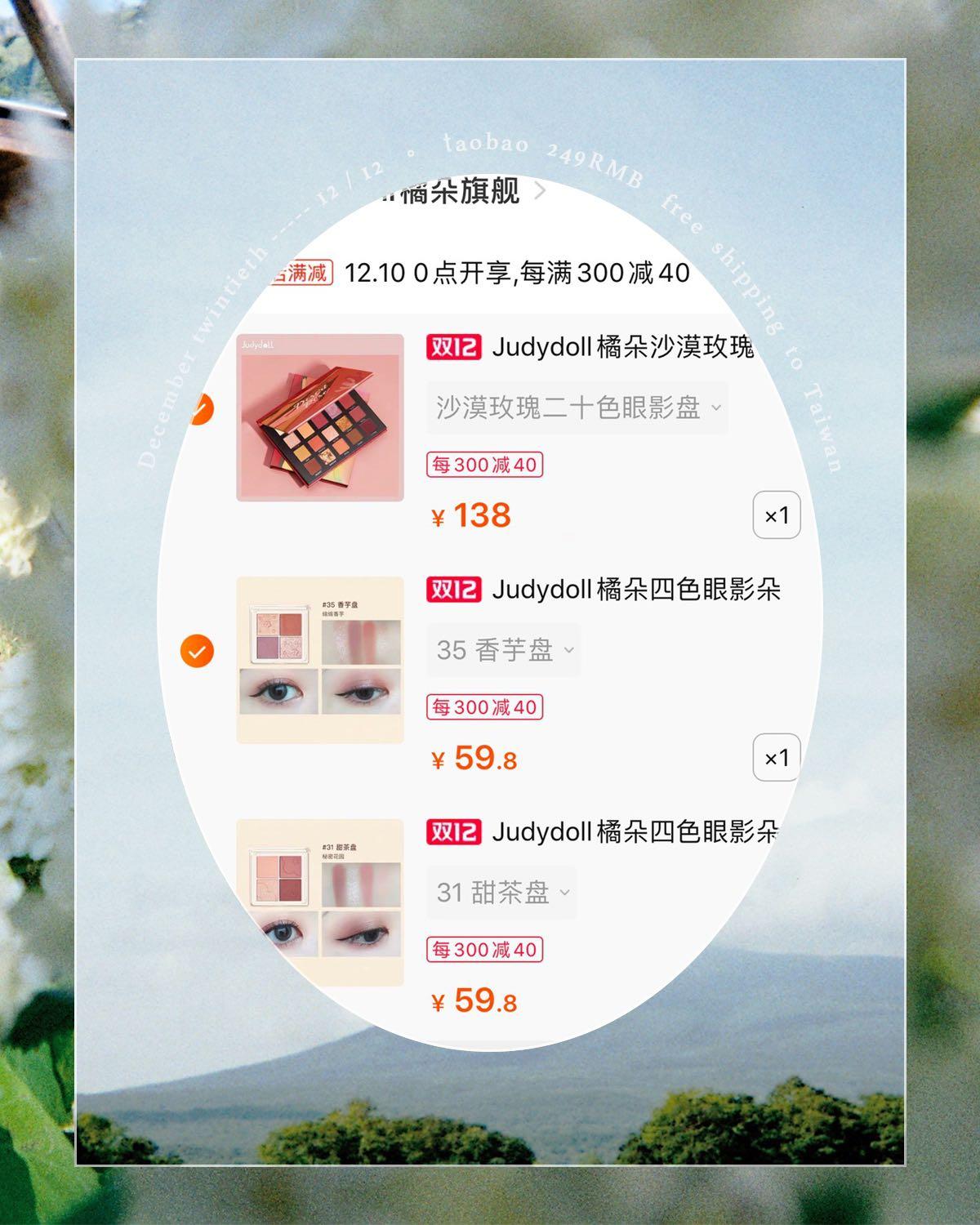 第一個放進購物車的是”Judydoll橘朵四色眼影朵朵盤奶茶ins超火珠光啞光新手細閃旗艦店”, 從命名開始就是少女心花開的口味, 輕柔又顯色的馬卡龍色調, 每一個都超級想嘗試!