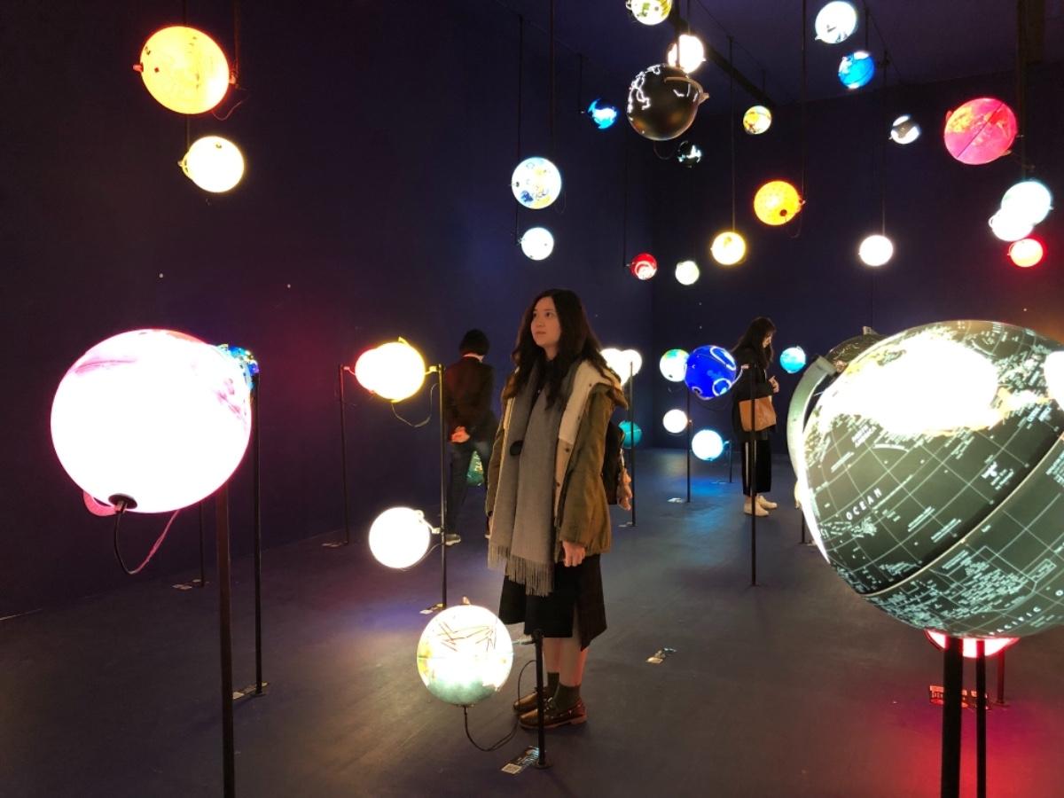 進入暗示,一個個鮮豔色彩的發光地球儀綻放著光彩,此為藝術家英果·古騰(Ingo Günther)的作品~