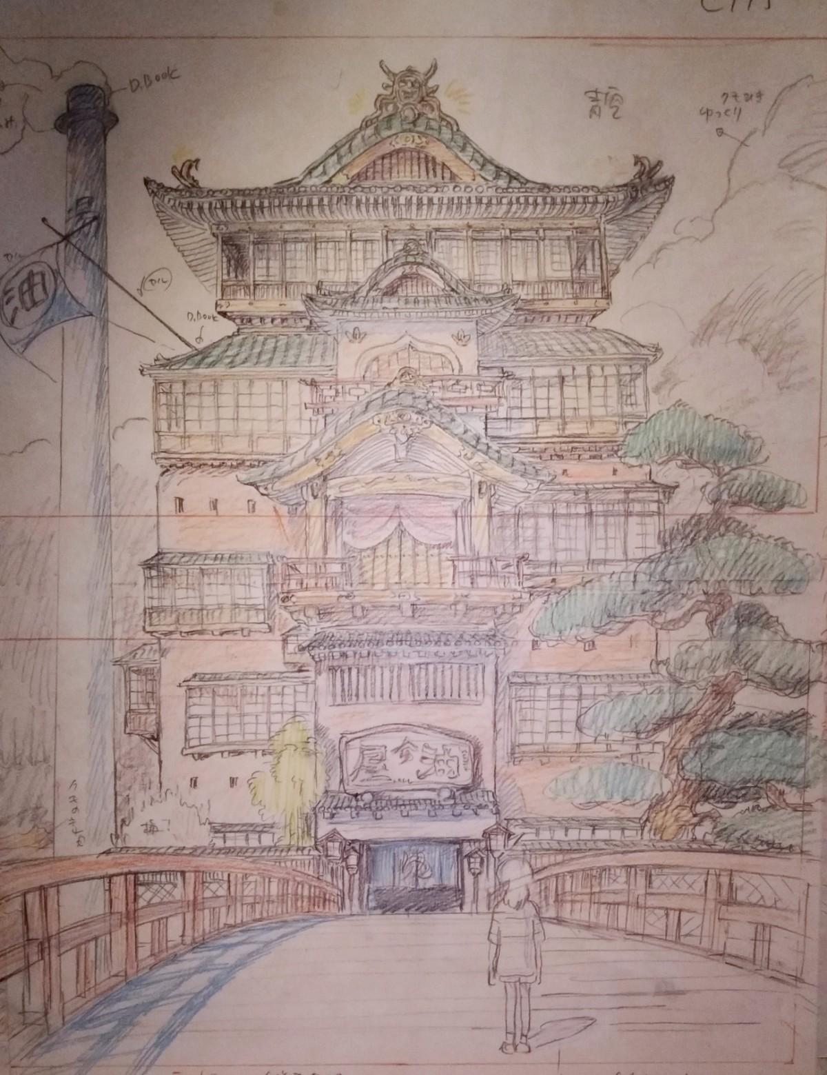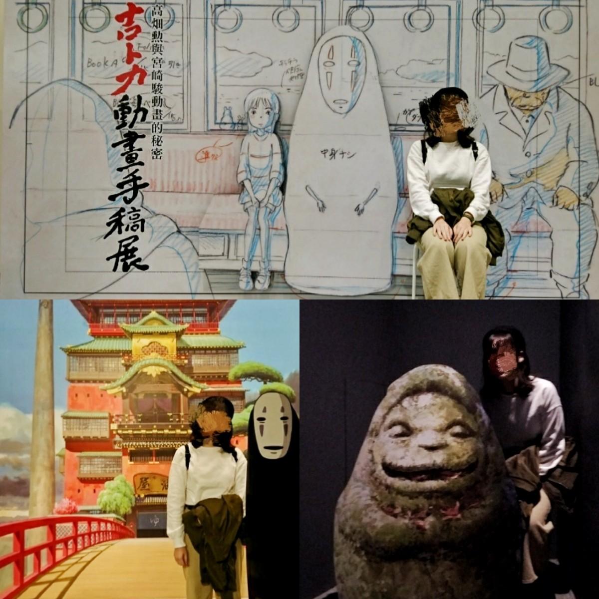 先是《風之谷》、《天空之城》、《魔法公主》等的多幅手稿先讓大家吃驚,如此細微的筆觸、背景、機械構造都讓人看得入神。接著來到最經典的「神隱少女」,在進入湯屋前,先和那顆神像石頭與大型湯屋圖稿合影,之後看見壯觀的手稿佈置映入眼簾,將我們包圍在「那個世界」,搭配著片尾曲いつも何度でも,真的只有「感動」可以形容。