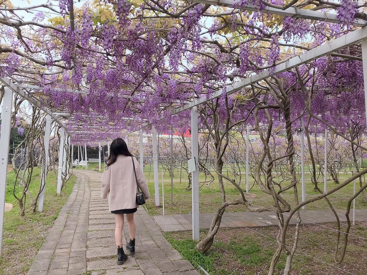 📍新北市淡水區屯山里石頭厝2-1號 據說是一年只綻放10天的紫藤花,淡水這裡有分一區和二區,來的時候花況剛好還可以,很美,園區裡還有巨大Mogi!超可愛🥰