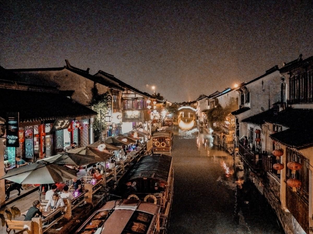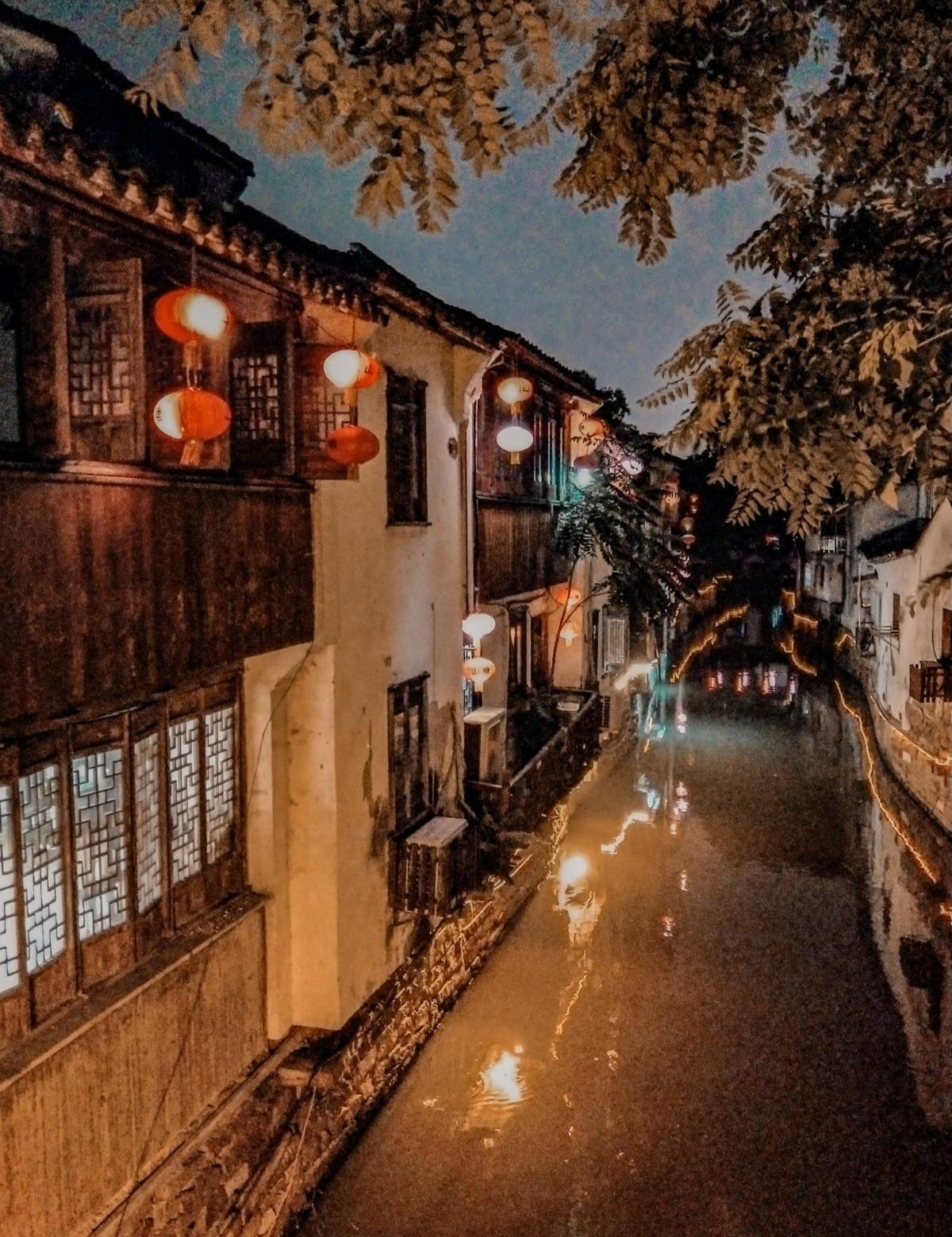 在飯店不行約20分鐘 算是有點距離的地方 但也是Claire 這次旅途最喜歡的地方 晚上的燈火闌珊悠悠映在溪流上 兩旁古色古香的老街 中間一彎小橋 兩旁的街道販賣旗袍 書法 酒吧...(沒有食物)彷彿穿梭來到宋代的夜市般 完成我心中的小心願 這裡就是相機拍不出那種美感只能靠眼睛收進回憶的那種地方~