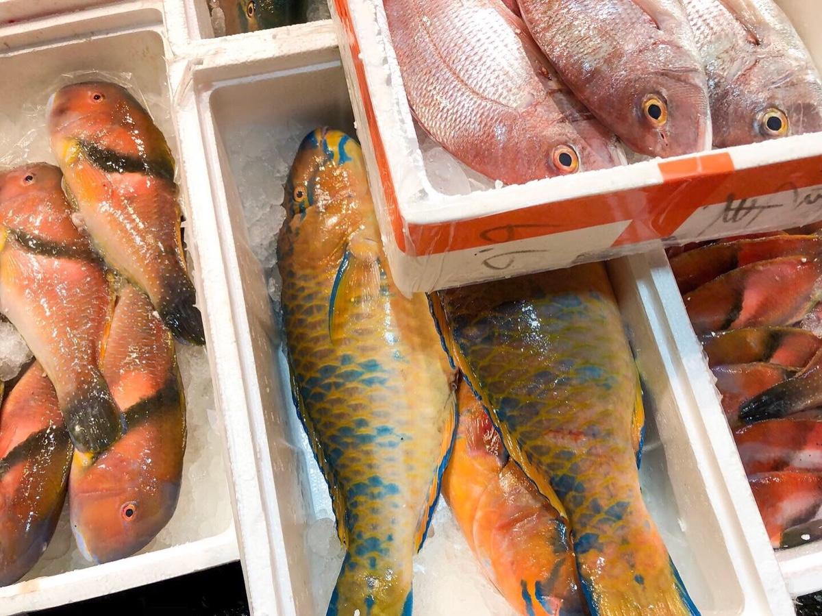 至於海鮮的部分,真的很新鮮又划算👍🏻我們買了一籃大蝦子和一堆魚類跟螃蟹,回家6個人吃超爽😋這樣的分量在外面吃,好幾張藍色小朋友一定跑不掉!喔對了,那邊也有甜不辣之類用魚漿做出來的東西,都很好吃,好像怎麼買都不夠😏