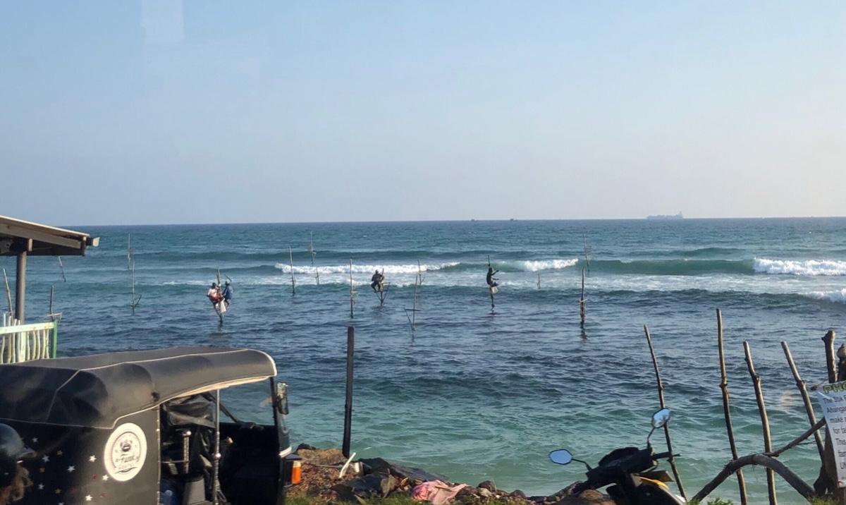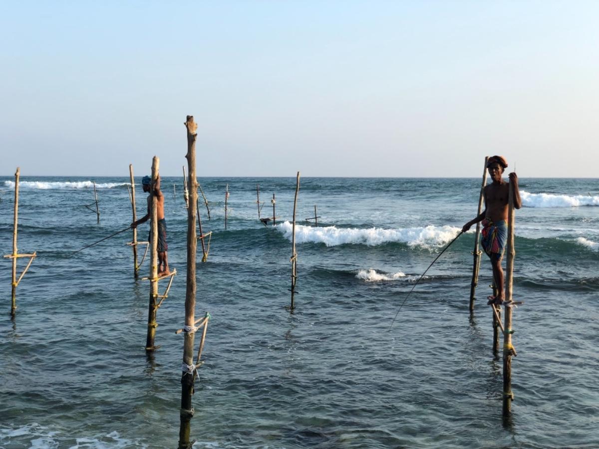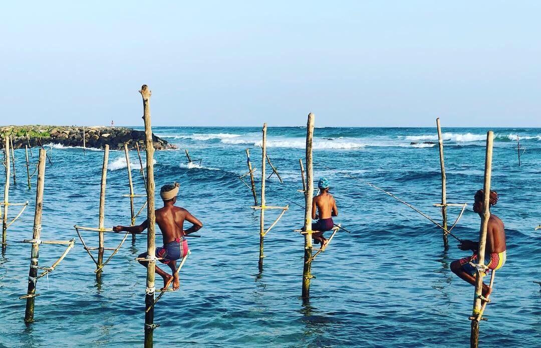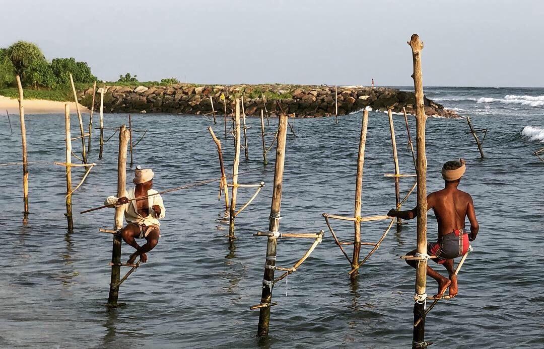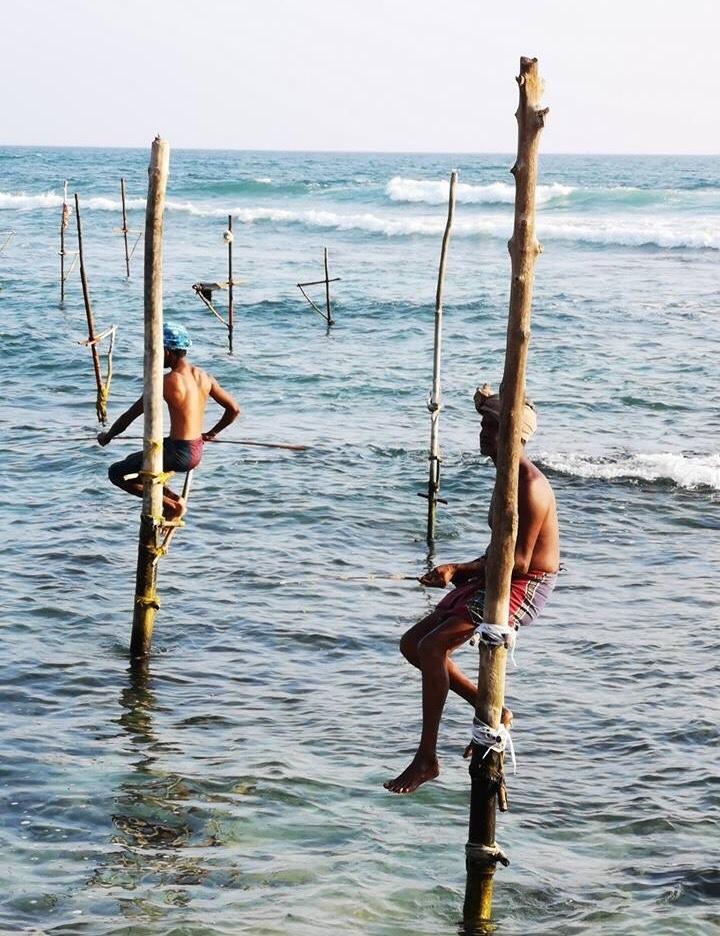 高跷钓鱼是斯里兰卡的渔夫们祖祖辈辈流传下来一种独特的捕鱼方式。来到Galle附近的Koggala,可以看見海上插著很多木桩,上面坐着一些渔民,正在用他们传统的方式钓鱼。