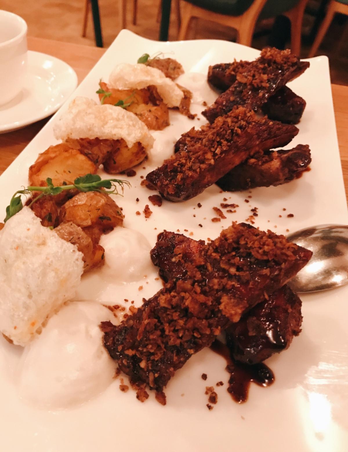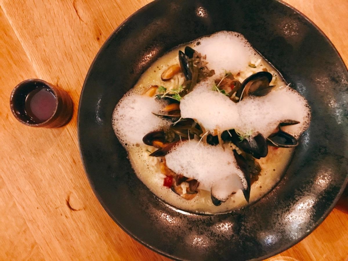 在餐桌上有一本介紹,說自己是來自太空的傳統料理! 上菜之前,有一位穿著白袍跟實驗室眼鏡的男士,端著很多試管🧪站在餐桌旁說,吃我們家的料理首先就是要清清你的味蕾,隨即在試管中滴入薄荷精油加上乾冰。請你將乾冰的煙吸入鼻腔淨化一下(花招真多)