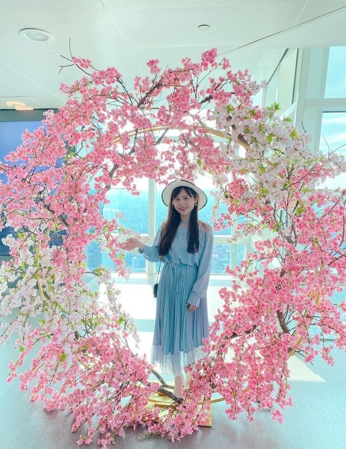 也許是配合春季的概念,在觀景台樓層來設有一個大大的櫻花花圈,大小剛好夠1-2個人在裡面拍照合影,雖然現場看有一點突兀,但是拍起來的效果還不錯! 哈這個可能是季節限定款喔~
