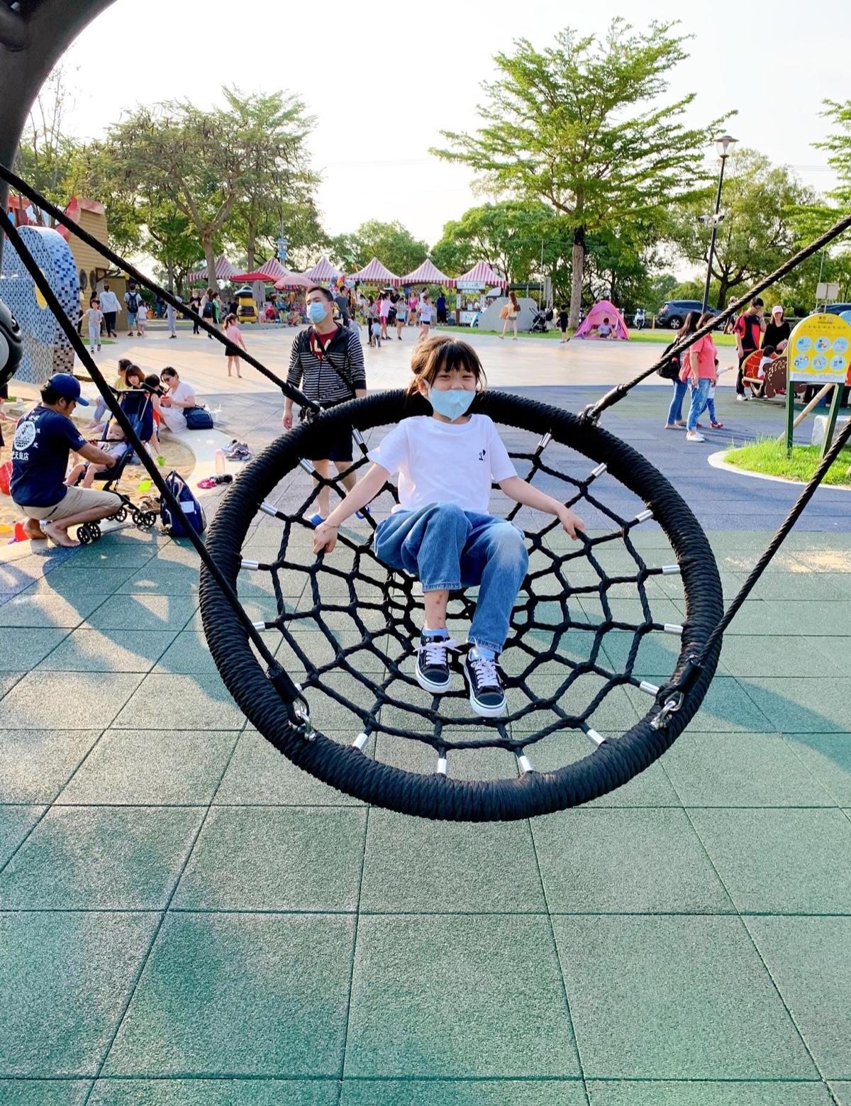 鞦韆的部分跟以往看到的傳統鞦韆不同,可以承重150公斤的網狀圓盤,可躺或2-3位小朋友一起盪,比傳統更加有趣。