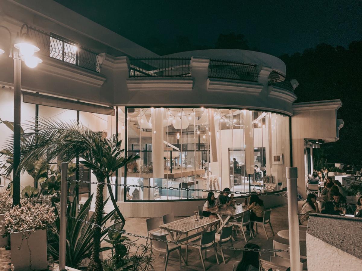 夜晚燈火通明的眺高餐廳,擁有室內與戶外的餐桌選擇。
