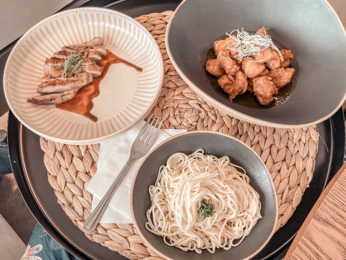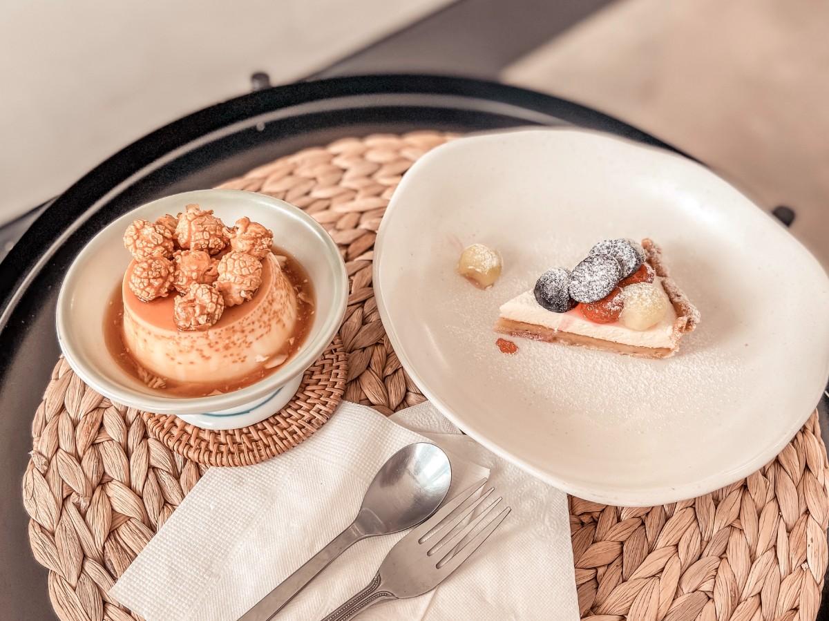 介紹一下餐點,香煎櫻桃鴨腿、香酥炸雞腿排、蔥油拌麵、焦糖不雷、水果派、滿山重奶茶,來説説櫻桃鴨的口感,不會太有嚼勁,調味也可以,炸雞腿排肉質很嫩不會太油膩,蔥油拌麵的蔥油香氣十足,麵條軟硬適中,套餐附的前菜和湯相較之下就顯得一般,焦糖布丁上有焦糖爆米花,吃起來沒有苦味只有焦糖甜味,水果派挺不錯但水果有點不美🙃