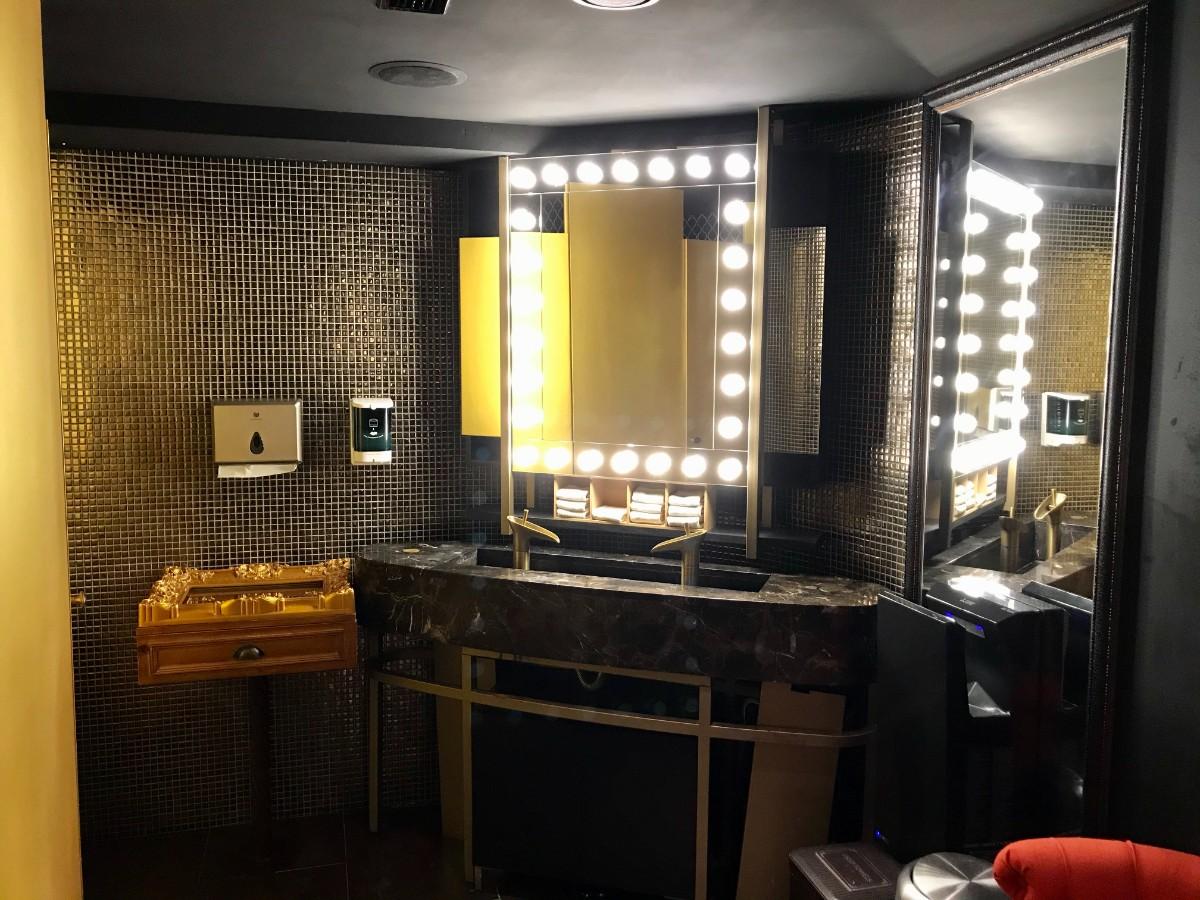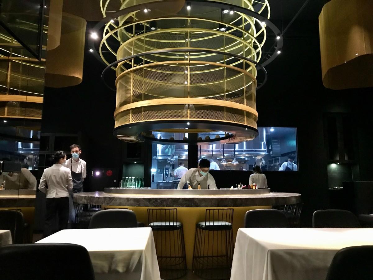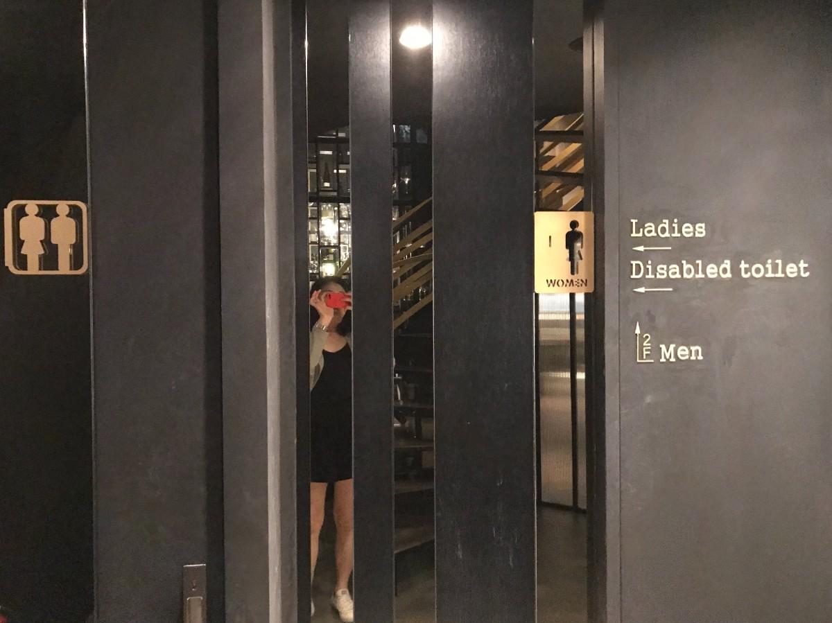 抵達餐廳門口時,被那富麗堂皇的外觀震驚住,雖說華麗,但卻是內斂低調不張揚,很有吸引人想一探究竟的魔力。室內裝潢也是走深色低調奢華風,挑高的天花板讓人覺得空間十分寬闊,即使燈光幽暗也不感覺壓迫,打在桌上的燈像聚光燈,照亮桌面形成一整個圓,桌面的亮度很足,不會像摸黑用餐,很有氣氛,另外一旁靠牆座位是沙發座椅,看起來頗舒服,而化妝室則是走一個非常現代摩登的設計,讓人覺得走進的不是廁所,是攝影棚。
