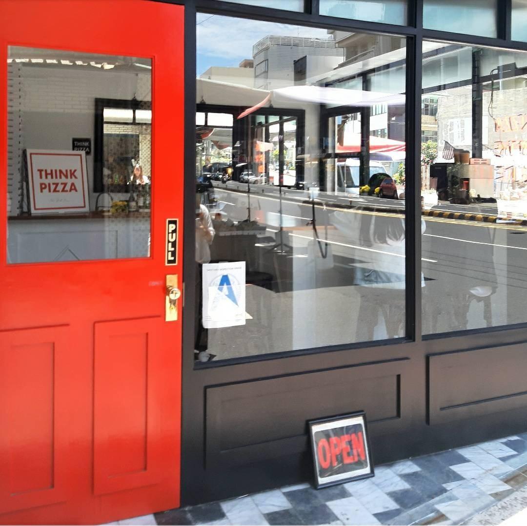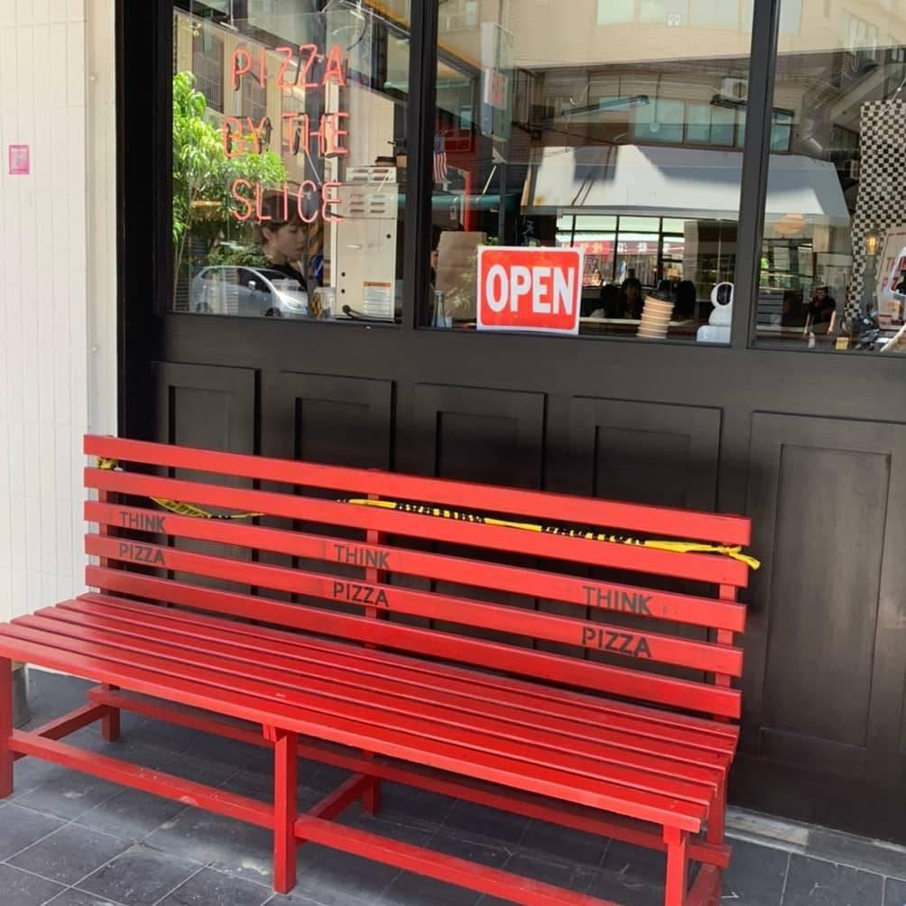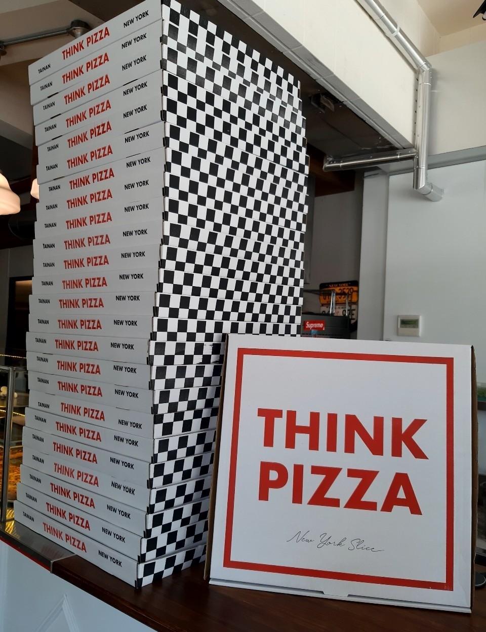 從店門外的窗戶反射就能看到裡面thinkpizza的logo盒子❤️