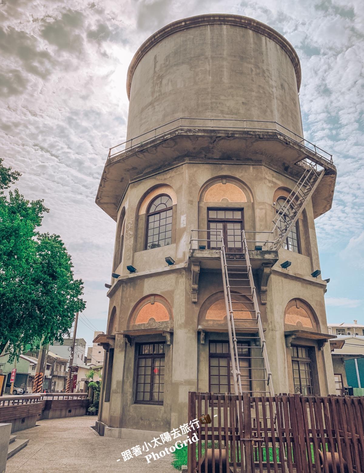 水塔共分三層,三樓是圓柱體,最上層是圓柱鋼筋混凝土蓄水塔,設有維修用護欄,中、下層十角形構造物,每面開半圓拱形門窗,當成辦事處、會議室與維護空間。