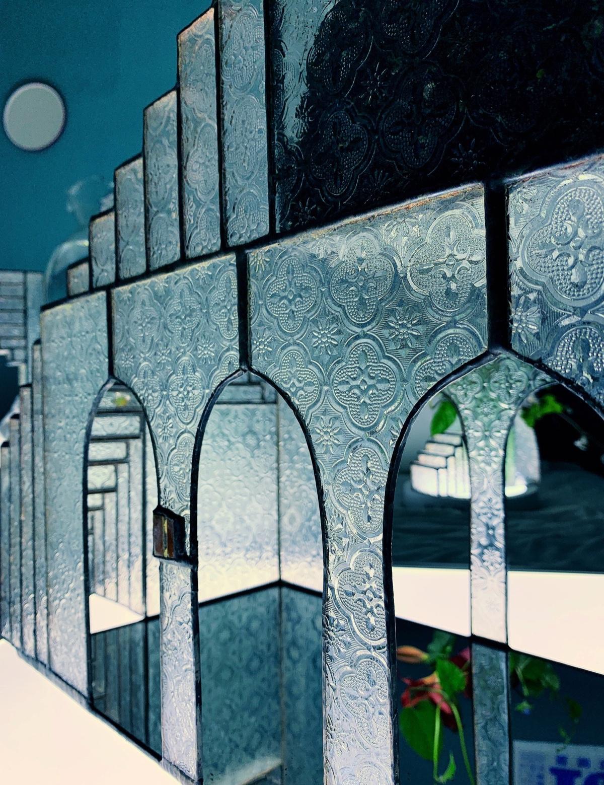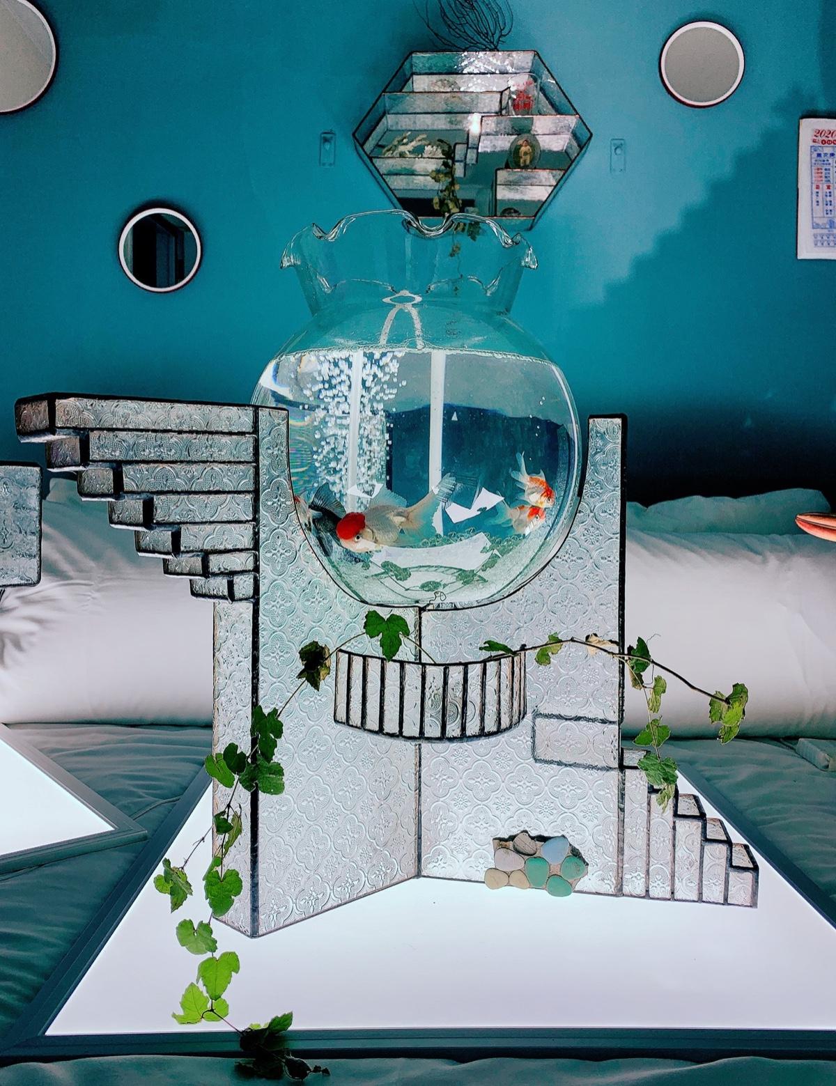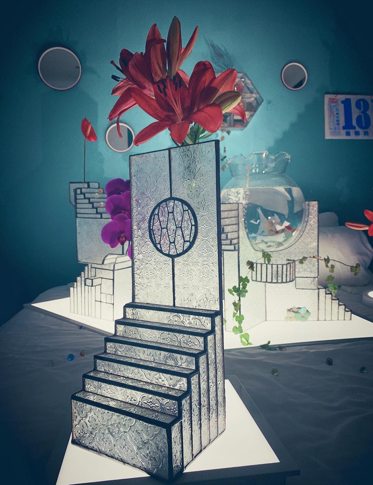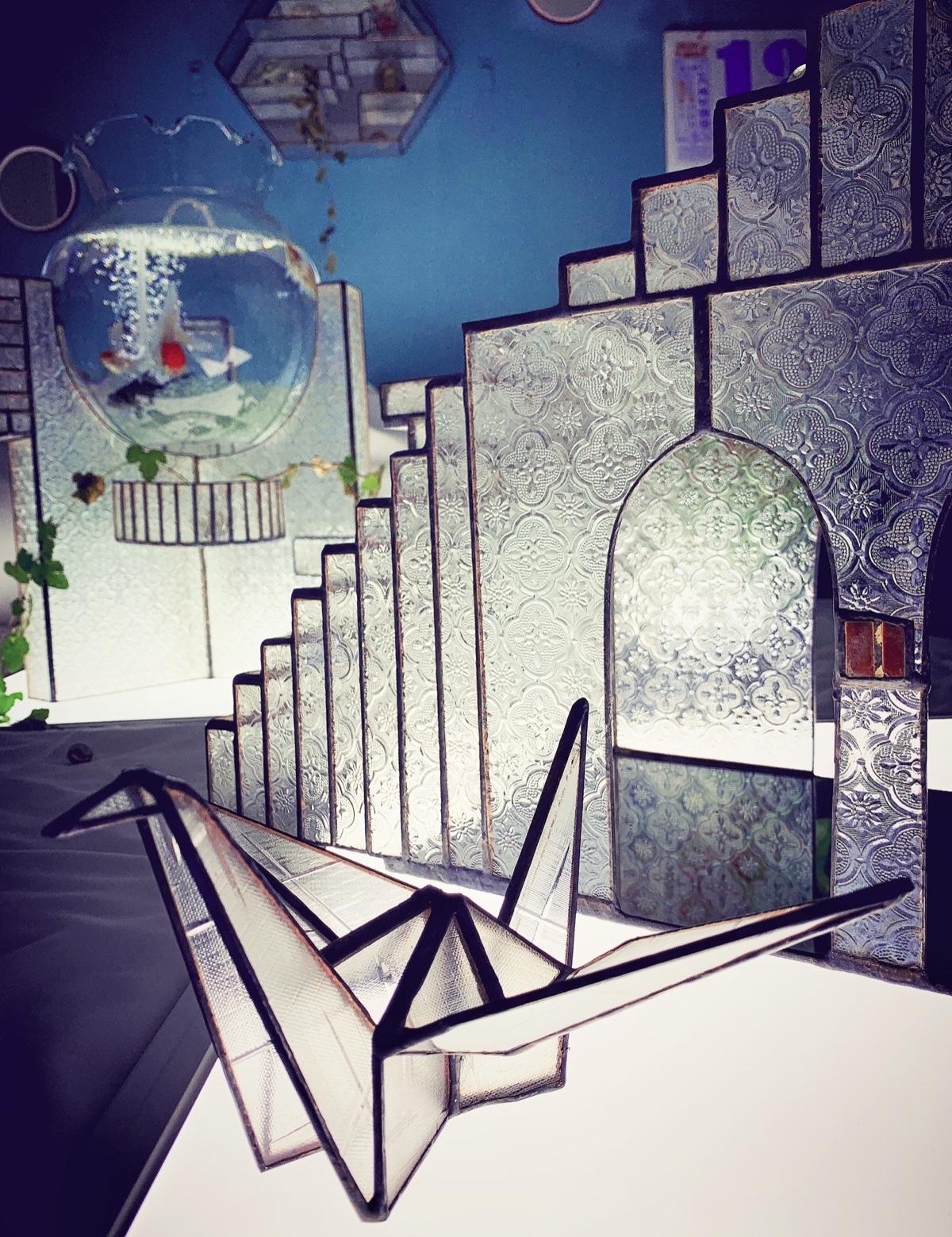 這次自愛的主題取名為「步登公寓」。既然是公寓,自然就是以階梯形成的一個意象。鍾小姐以細膩精巧的焊接手法,將窗玻璃鑲嵌在構圖繁複的架構中。同時因為這次的作品結構頗大,沒有適合的器具能安置正在焊接的作品,因此每一樣作品在焊接時,她都必須把作品抱在身上施作,非常耗時且耗體力。這次展中甚至還有一樣作品中間放置了很大的一個魚缸。鍾小姐說原來她想做兩層,但因為太耗體力,而且怕作品高度太高又加上魚缸會危險,所以還是只做了一層。