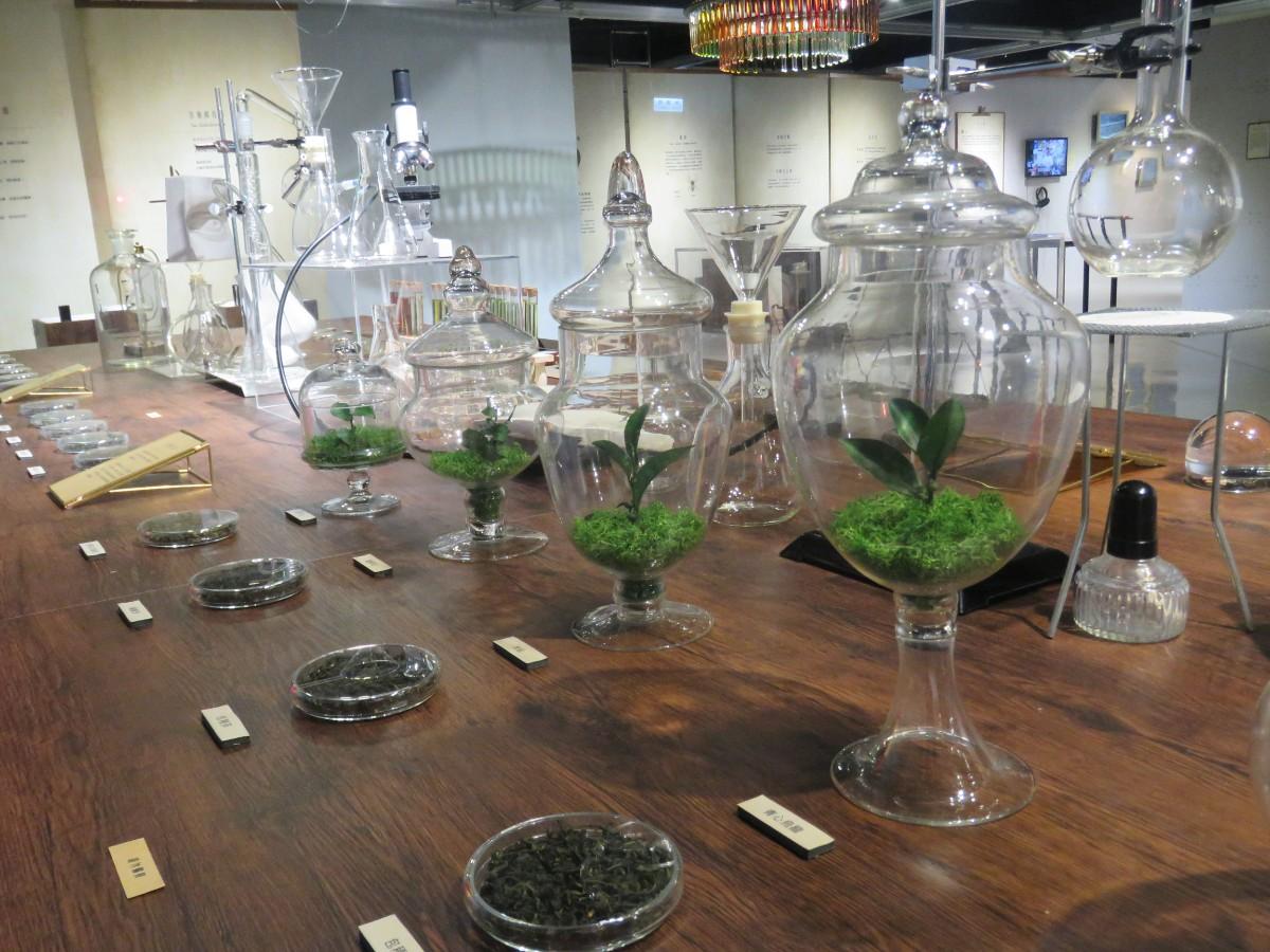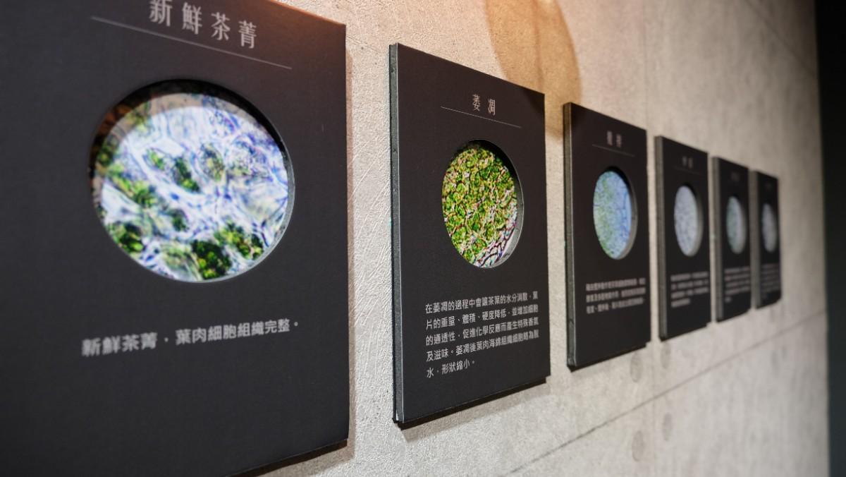 茶樹、茶葉、茶花、茶籽的彩色素描,一系列色彩鮮艷的細胞照片,擺放了許多玻璃瓶與器具的大長桌宛如實驗室當中的工作台,觀眾能夠利用放大鏡仔細觀察茶乾與葉底的樣貌,而裝在試管當中的各色茶湯,也讓人能夠一目了然各式茶類的茶湯顏色,藉由最直觀的視覺在觀者的腦海中建構出茶最基本的樣貌。
