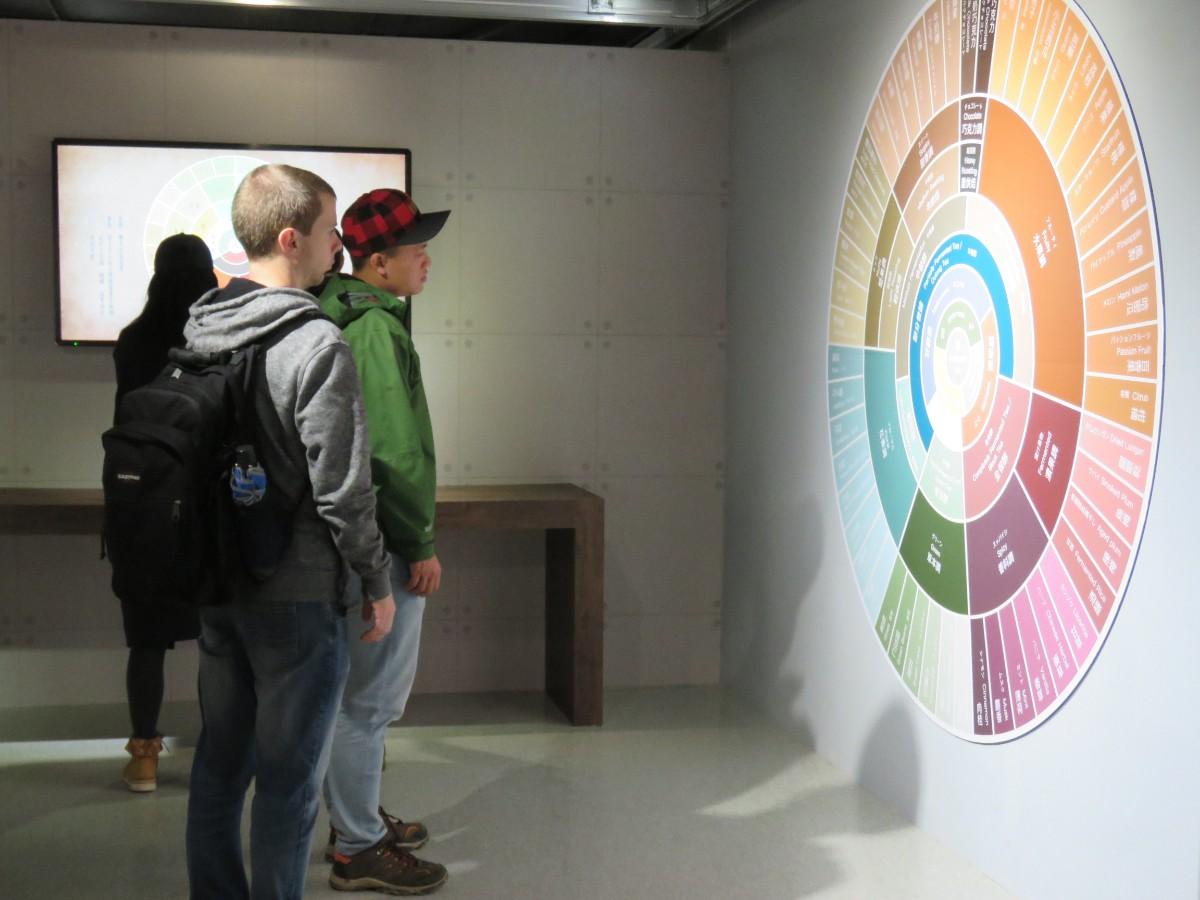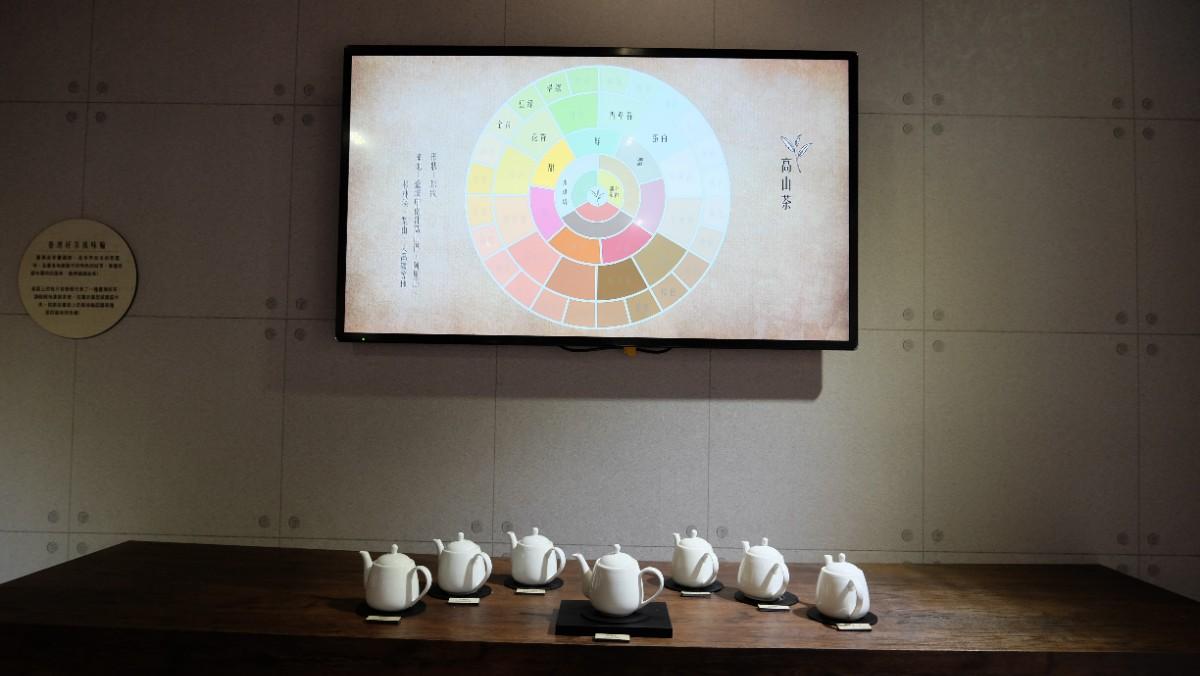 味覺展區羅列了由兒茶素、茶胺酸、咖啡因三種成分主導形成的酸味、苦味、甘味、回甘、澀感等茶湯滋味是如何在發酵度、烘焙度、沖泡溫度等條件差異下產生,展區中央也擺放了熱泡、冷泡、冰滴等沖泡方式所使用的器具,詳細解說沖泡溫度對茶湯味道的影響。並在另一面牆掛上一幅巨大的風味輪,將茶的香氣、滋味、口感等抽象感受轉化為具體文字描述,進行系統化的分類,讓茶的各種風味可以透過一致性的語言被討論與記憶,也為茶湯品茗提供了依據。現場也設置了風味輪主題的互動遊戲,觀眾只要把桌上任一茶壺放到感應區,螢幕上便會出現該類茶的風味輪,十分有趣。