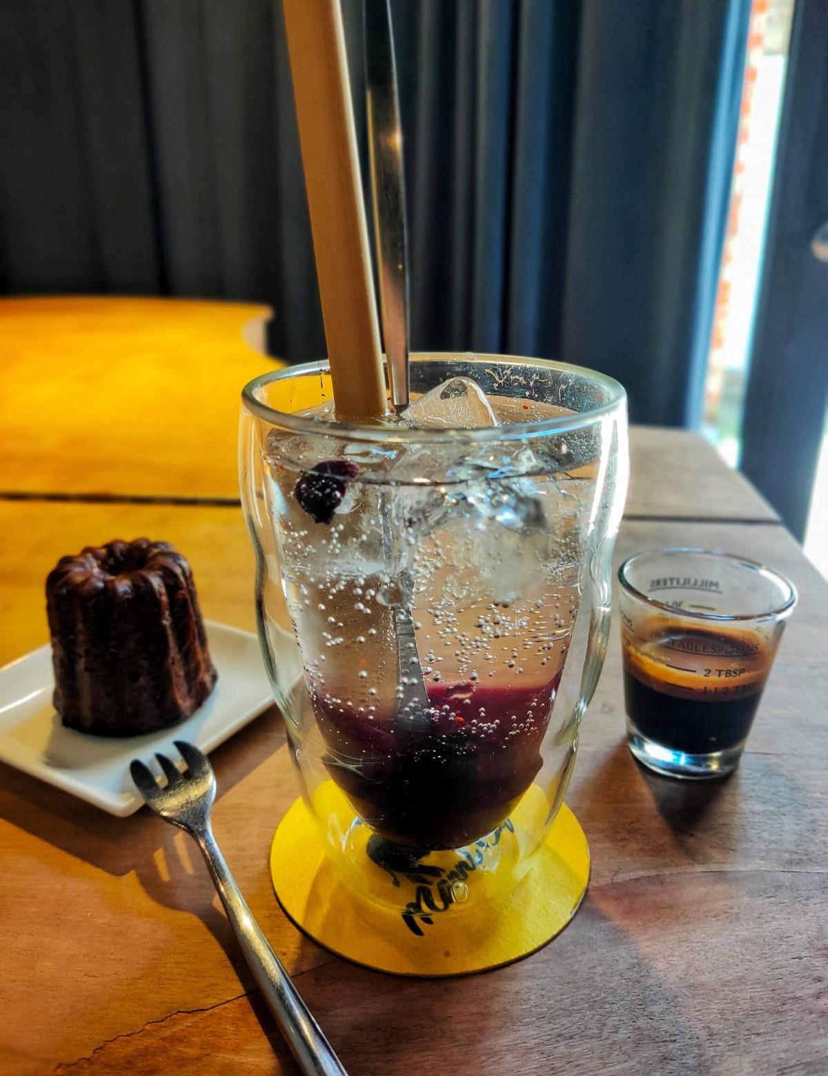 #果醬蘇打冰咖啡 (莓果)-💰$130元,這咖啡是我最好奇的,因為目前還沒喝過這樣的咖啡😁,蘇打氣泡水加入手工果醬,喝起來甜而不膩,氣泡水再加入濃縮咖啡,讓咖啡除了香氣還可以喝到水果的甜蜜與淡淡的氣泡口感👍。