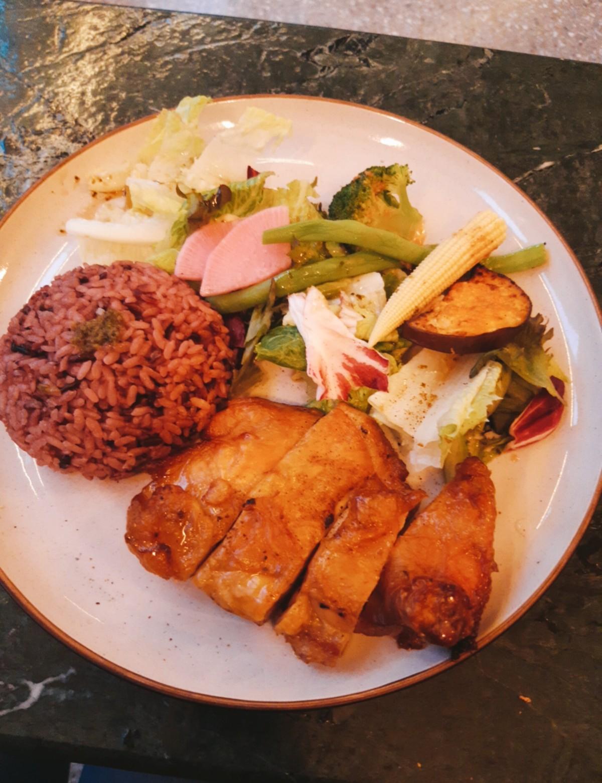 我當天點了一杯清焙烏龍玫瑰冰茶和馬告烤嫩雞腿排米飯,飲料部份,我覺得沒特別出挑,中規中矩,但看起來是挺美的~ 至於餐點,我覺得雞腿排處理得很好,鮮嫩多汁,推推!