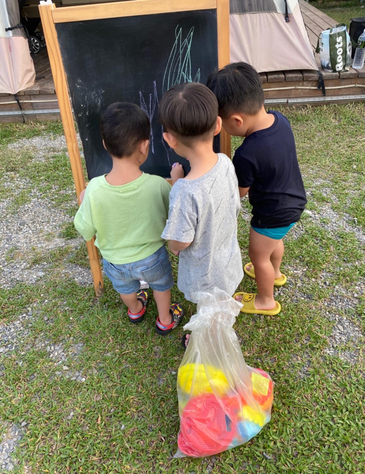 我們住的是狩獵帳,狩獵帳外面有可以玩像夜市一樣的投瓶子;孩子們也玩得非常開心,這邊每一戶帳篷也放有黑板可以讓大家畫畫或是當作拍照的道具紀念這次的露營,十分貼心