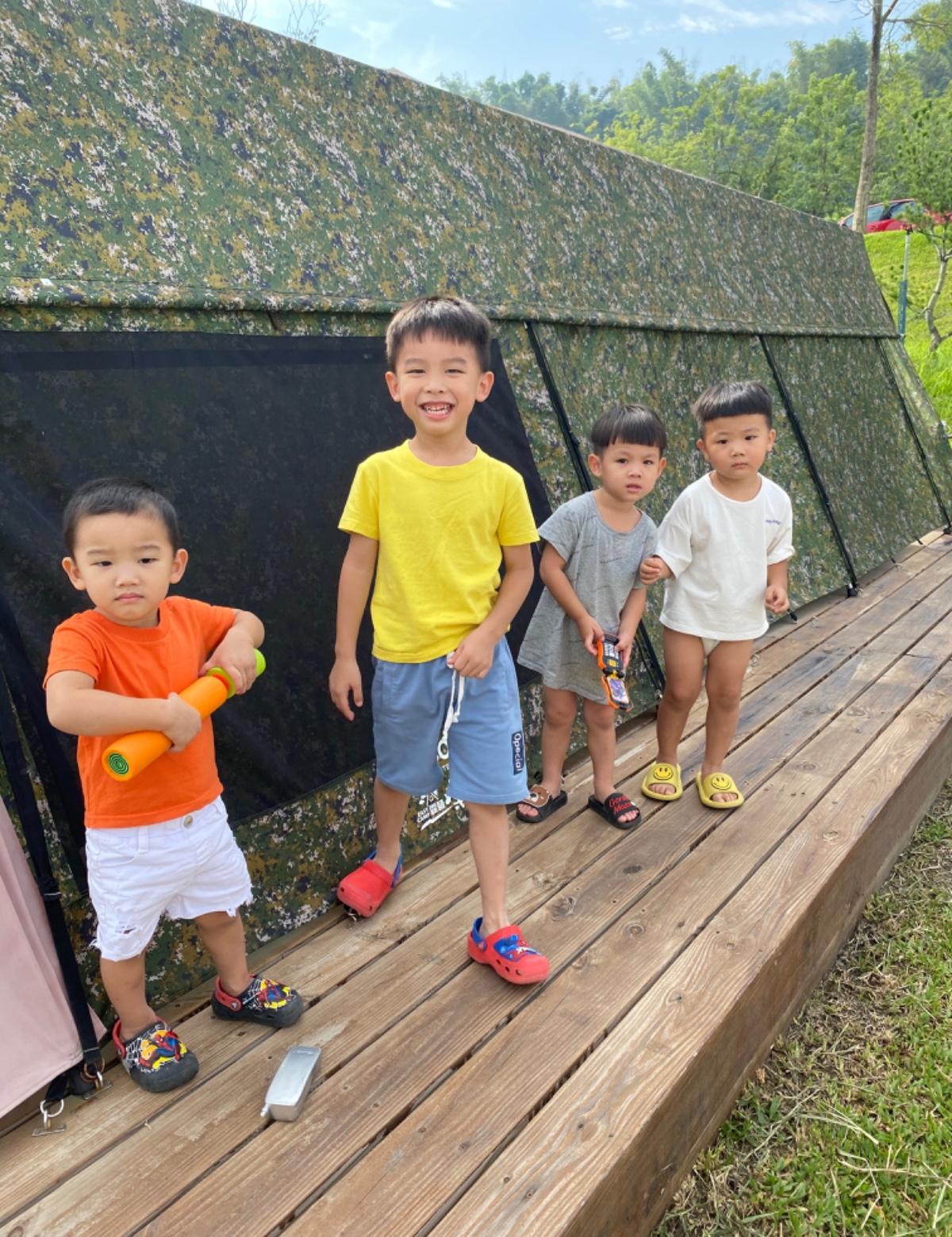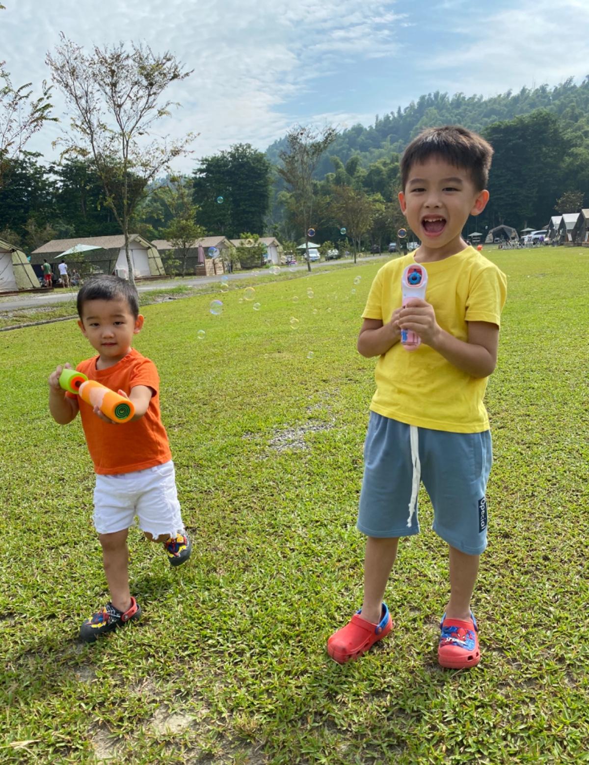早晨起床的空氣清新美好;孩子們還在帳篷外大玩玩具(玩具是我們自備的),然後爸爸媽媽們還能好好再睡一下回容覺補眠,因為有大草皮孩子們就可以玩得十分盡興