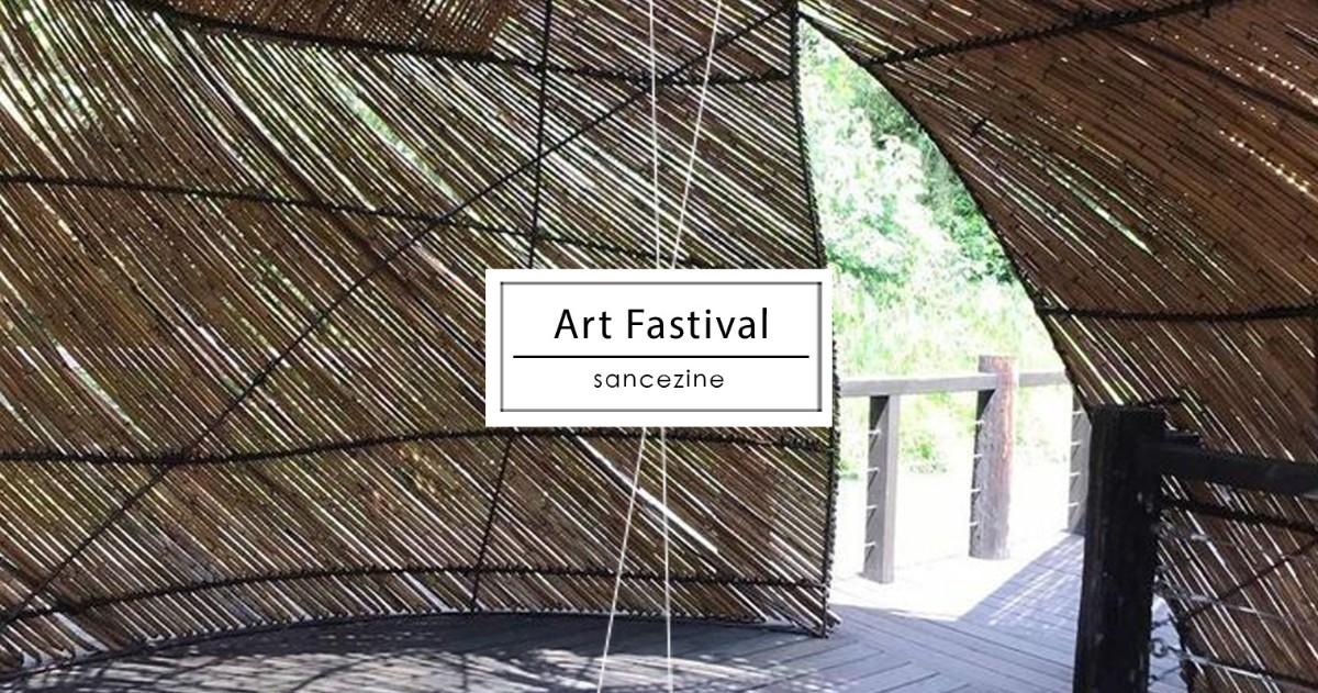 藝術季在池上水利公園總共有三件作品,從橋下的大路彎進來,「在河之間」是最後一件,也是最長的一件。竹編的材質的作品融入河流、森林之中,蜿蜒著並順著水流,有高有低,有溪水與鳥叫、蟲鳴相伴。抬頭是炙熱的太陽,要是熱了就跑到竹屋下,即可享受片刻清涼。